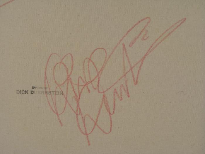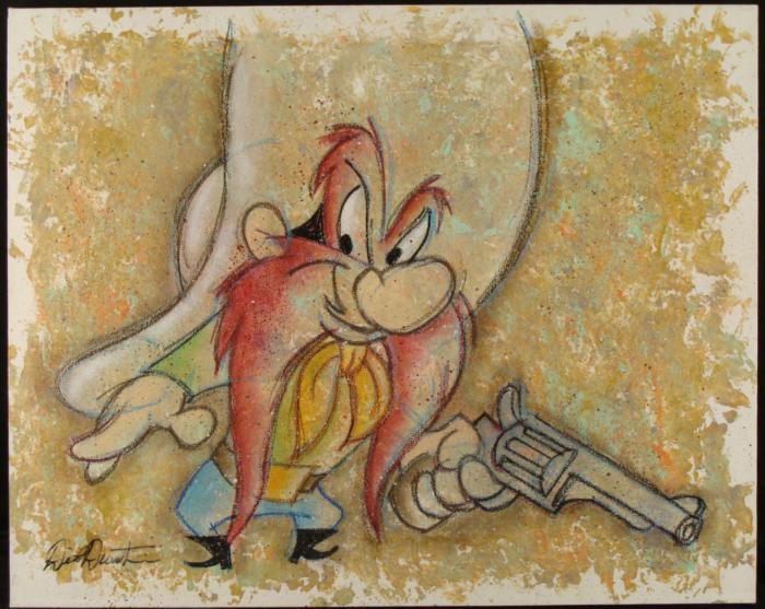 This original painting portrays that rambunctious character Yosemite Sam. Artist Dick Duerrstein captures that Don't Mess With Me gaze, and gives it a nice background of Western tones and colors.Artist: Dick Duerrstein Medium: Acrylic paint on stretched canvas Signature: Signed by the artist, lower left, and on the versoMarkings: Artist name stamped on verso and on the frameDimensions: 24" x 30" Condition: Mint Certificate of Authenticity: IncludedBring a little of the rowdy Wild West to your home with this great original Yosemite Sam painting! Duerrstein's work can be found in the Walt Disney Studio corporate offices, Burbank, California; The Library of Congress, Washington, D.C. and St. Jude's Research Hospital in Memphis, Tennessee and private collections worldwide.