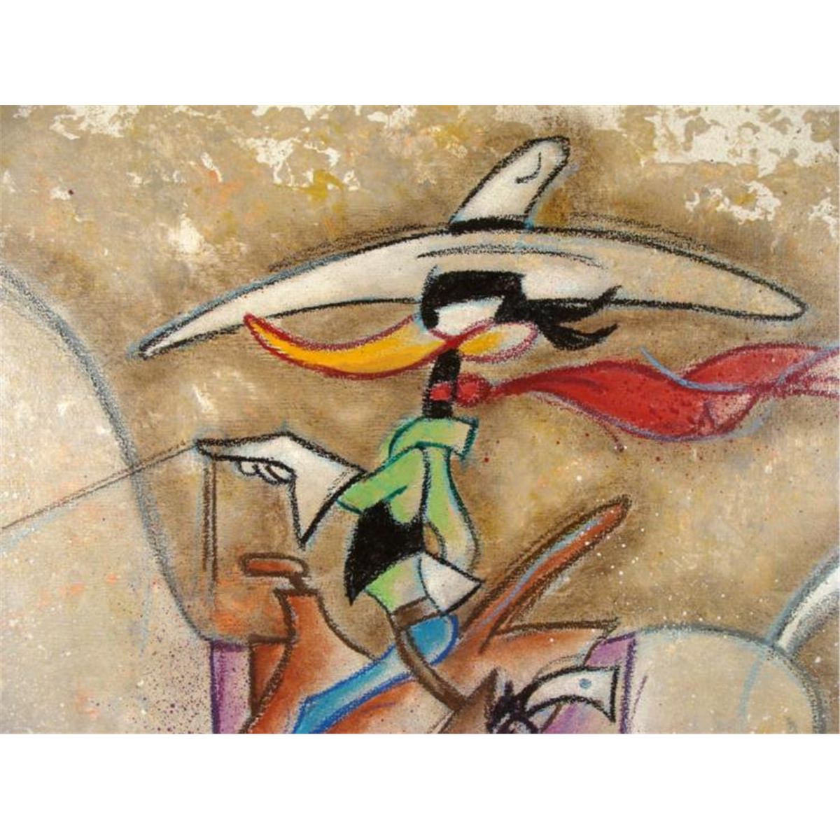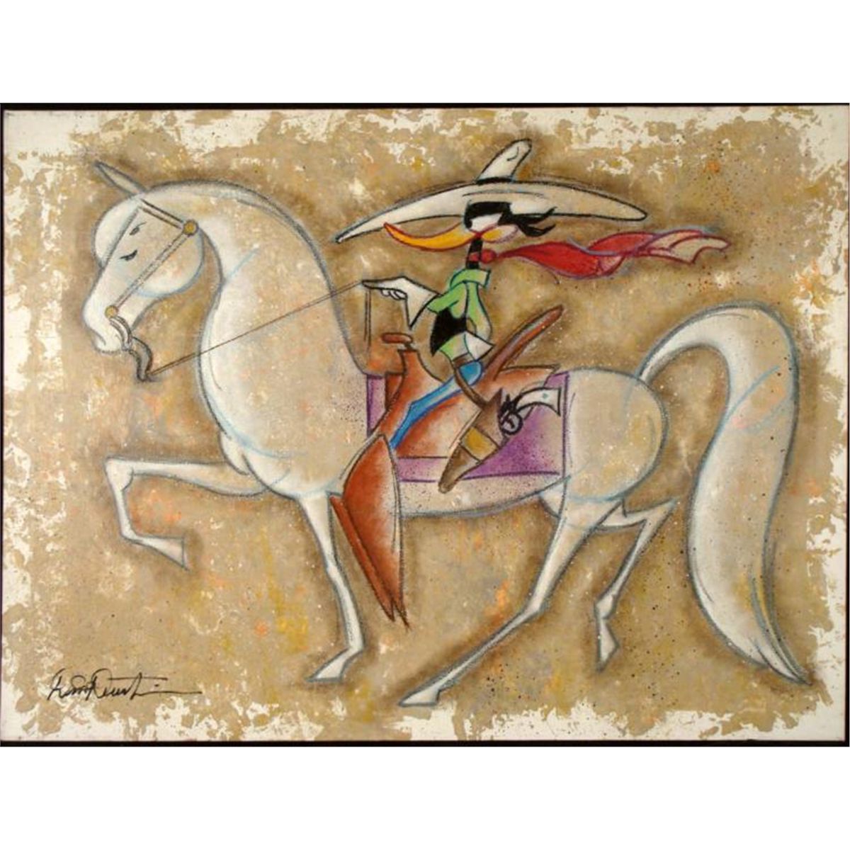 Daffy Duck has a look of determination in his eye as rides into town on great white stead. The background has a splotchy quality, giving the impression that Daffy's riding through a desert region. This original painting was done by Artist Dick Duerrstein who knows how to capture the daffy and the serious side of that famous duck. * Artist: Dick DuerrsteinMedium: Acrylic paint on stretched canvas Signature: Signed by the artist, lower left, and on the versoMarkings: Artist name stamped on versoDimensions: 30" x 40" Condition: Mint Daffy is a duck of conviction, as one can clearly see in this terrific original painting. * Duerrstein's work can be found in the Walt Disney Studio corporate offices, Burbank, California; The Library of Congress, Washington, D.C. and St. Jude's Research Hospital in Memphis, Tennessee and private collections worldwide. *