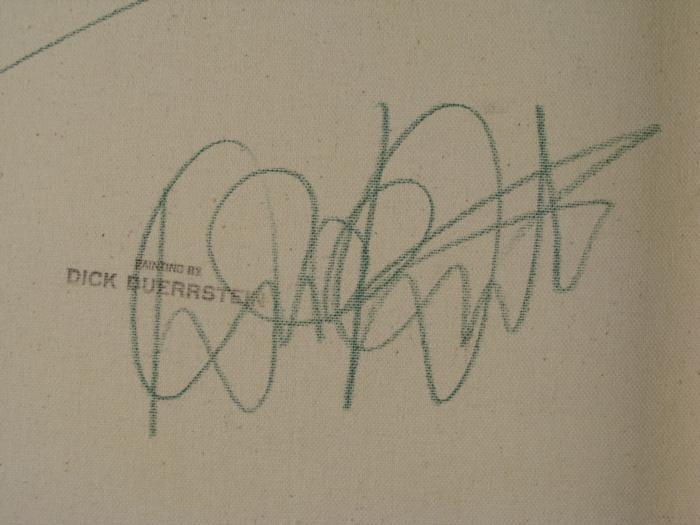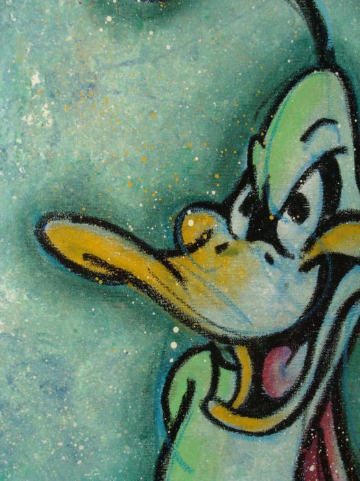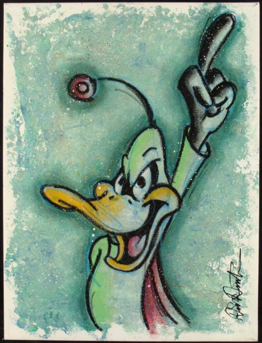 This is an original painting of Daffy Duck inspired by a scene from the animated short Duck Dodgers. Artist Dick Duerrstein know his animated characters and episodes quite well, and here he has captured Daffy in an intergalactic shade of green. Artist: Dick DuerrsteinMedium: Acrylic paint on stretched canvas Signed by the artist, lower right, and on the verso Other markings: Artist name stamped on verso, and on frame Dimensions: 18" x 36" Condition: Mint Certificate of Authenticity: IncludedThis original Daffy Duck painting is truly out of this world! Duerrstein's work can be found in the Walt Disney Studio corporate offices, Burbank, California; The Library of Congress, Washington, D.C. and St. Jude's Research Hospital in Memphis, Tennessee and private collections worldwide.