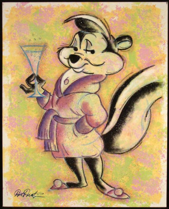 Here's that debonair skunk Pepe Le Pew, looking so fine in his robe, with a glass of bubbly. Artist Dick Duerrstein knows how to capture the mood with this colorful painting.Artist: Dick DuerrsteinMedium: Acrylic paint on stretched canvas, with flecks of glitter around the glassSigned by the artist, lower left, and on the verso Other markings: Artist's name stamped on versoSize: 29" x 36" Condition: MintBring a little swank style to your pad with Pepe Le Pew, looking more stylish than ever on this original painting! Duerrstein's work can be found in the Walt Disney Studio corporate offices, Burbank, California; The Library of Congress, Washington, D.C. and St. Jude's Research Hospital in Memphis, Tennessee and private collections worldwide.