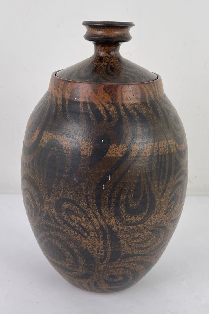 Lid is damaged and repaired as shown. 14" tall. Signed with his chop mark. Dick Evans (Born 1941) is active/lives in New Mexico. Dick Evans is known for Ceramics, painter-mod views. Dick Evans grew up in a small town in Texas and was not introduced to fine art until he went to university. Evans became a nationally known ceramicist before beginning his career as a painter in 1991. His paintings are abstract with large gestural stokes and rich color loosely resembling the landscape. Dick Evans works intuitively making no sketches or plans until he opens his palette and begins to paint. His paintings are how he expresses himself and his reaction to the world around him. When Evans was a toddler he under went a surgical procedure in which he was given ether. He remembers seeing flying figures with wings shaped like the end of crescents. This motif has reoccurred in Evans's work throughout his career.
