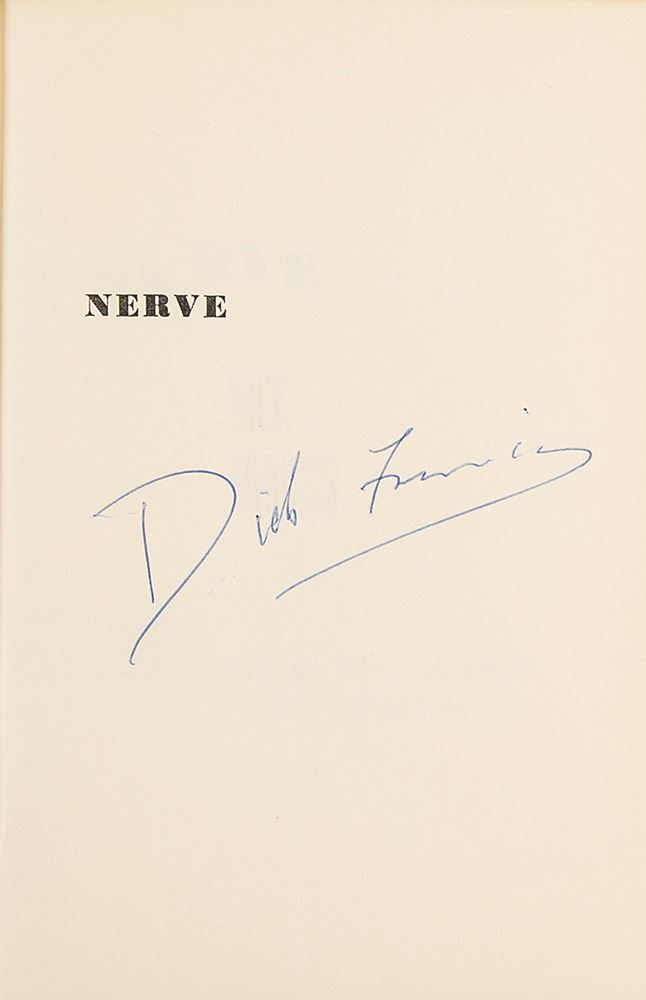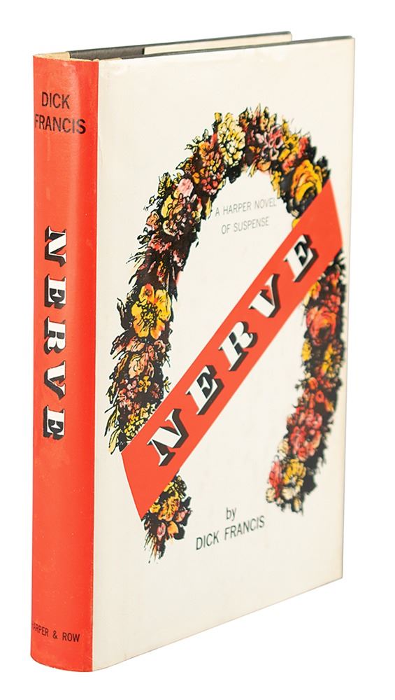 Signed book: Nerve. First American edition. NY: Harper & Row, 1964. Hardcover with dust jacket, 5.75 x 8.25, 273 pages. Signed on the half-title page in blue ballpoint, "Dick Francis." In fine condition. Accompanied by a custom-made clamshell box. A fine example of Francis's second novel.
