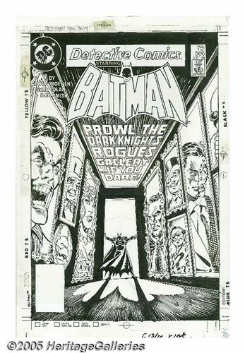 <B>Dick Giordano - Detective Comics #566 Cover Original Art (DC, 1986).</B></I> Join the Dark Knight in his rogues gallery... if you dare! Dick Giordano's moody, shadow-washed cover art for this issue of <B>Detective Comics</B></I> showcases some of Batman's most powerful foes, including the Penguin, Rhas Al Ghul, Two-Face, the Joker, Deadshot, Poison Ivy, and the Riddler. Includes the original logo type and masthead paste-up art. The image area measures 10" x 15" and the art is in Excellent condition.