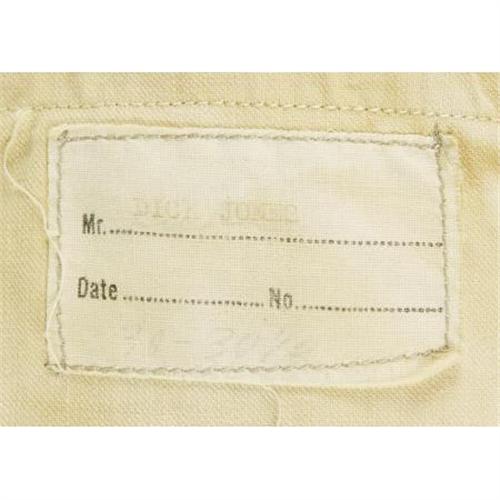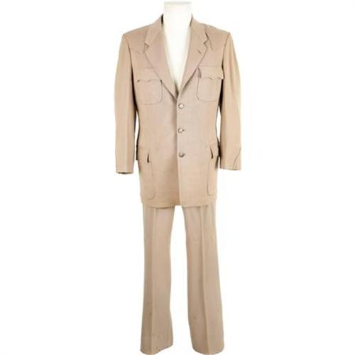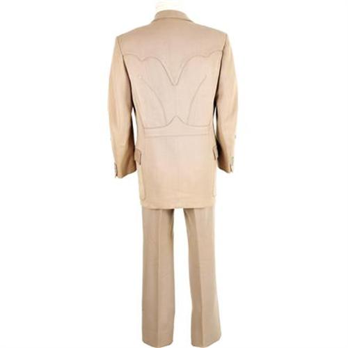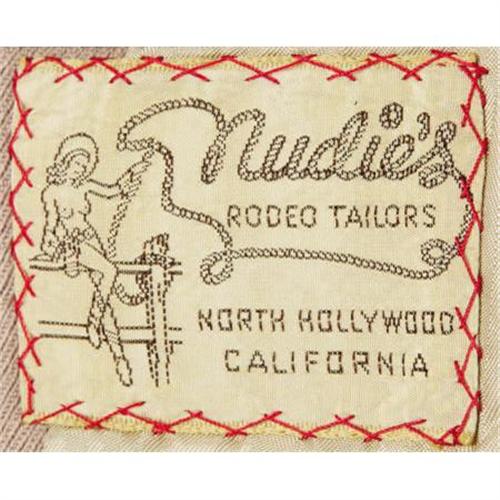 <B>Dick Jones Owned and Worn Nudie Cohn Suit.</B></I> A three-button, two-piece men's suit custom designed by Nudie Cohn for Dick Jones, star of the 1950s TV Westerns <I>The Range Rider</B></I> and <I>Buffalo Bill Jr..</B></I> The suit is in Excellent condition, with Nudie's trademark tag sewn on the right inside pocket. <I> Accompanied by COA from L.A. Prop and Wardrobe Co.</B></I><BR><BR><b>Shipping:</b> Clothing, Costumes & Jerseys (<a target="_blank" href="http://www.heritageauctions.com/common/shipping.php">view shipping information</a>)