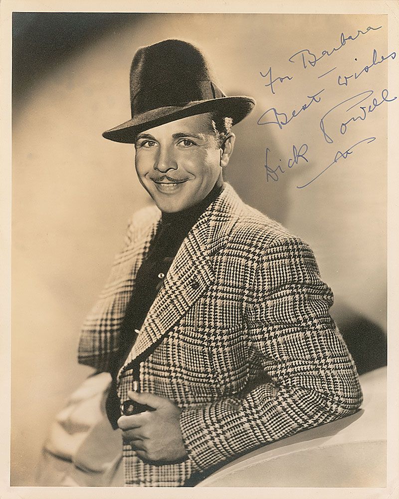 Vintage matte-finish 8 x 10 photo of Powell in a sports jacket and fedora, signed and inscribed in fountain pen, “For Barbara, Best wishes, Dick Powell.” In fine condition.
