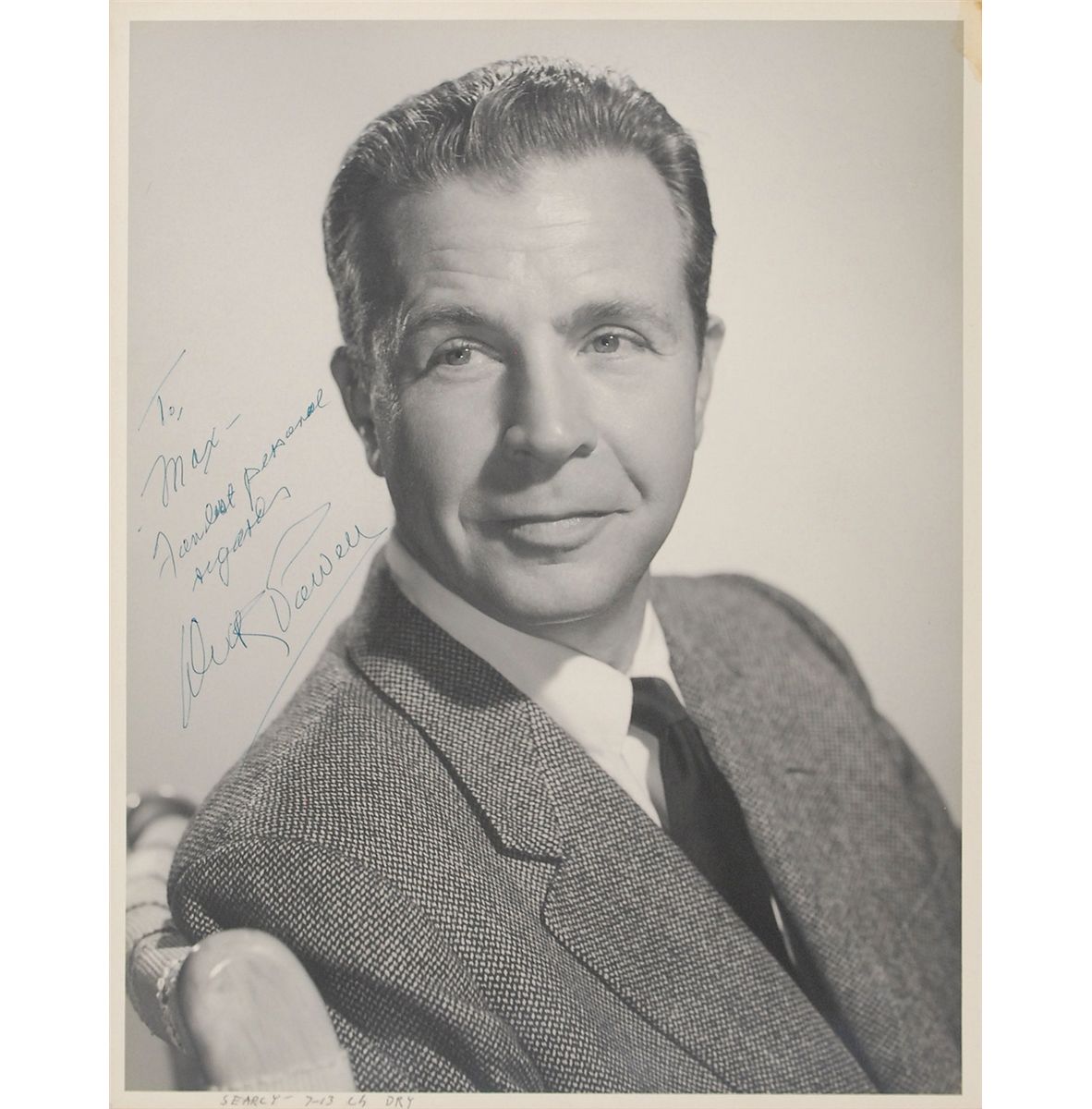 Vintage matte-finish 11 x 14 head-and-shoulders photo of Powell, signed and inscribed in fountain pen, “To Max—fondest personal regards, Dick Powell.” Affixed to a slightly larger board. In fine condition, with a ballpoint notation to bottom edge.