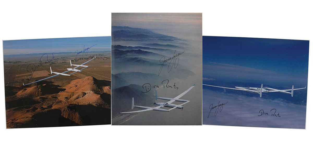 Three signed color cardstock photos of the Voyager in flight, two 20 x 16 and one 16 x 20, each signed in felt tip by Dick Rutan and Jeana Yeager. In fine condition. The Voyager was the first aircraft to fly around the world without stopping or refueling.