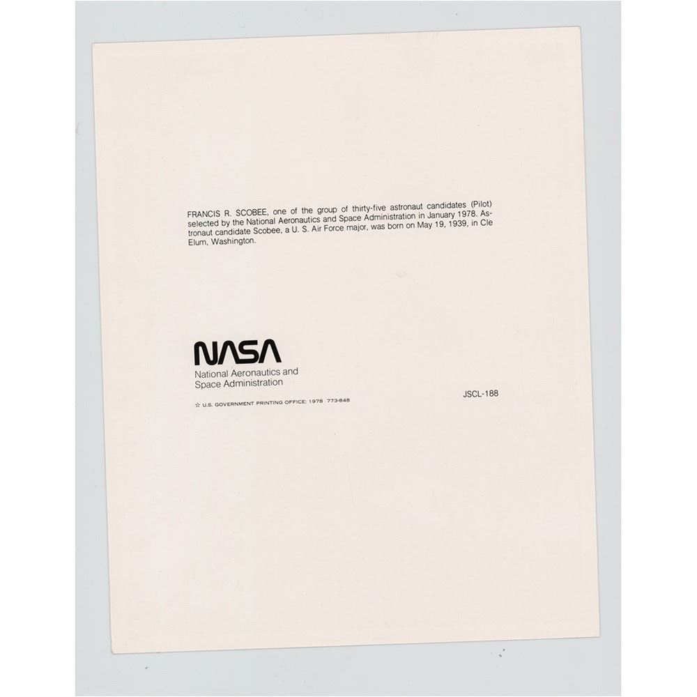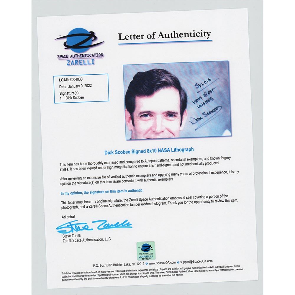Official color 8 x 10 NASA lithograph of Dick Scobee wearing his blue flight suit photo, signed and inscribed in black felt tip "Sylvia, very best wishes, Dick Scobee.‰Û In fine condition. Accompanied by a full letter of authenticity from Zarelli Space Authentication. A desirable signed portrait of the commander of the tragic STS-51-L Challenger mission.