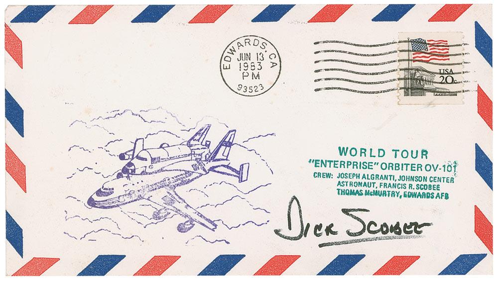 American astronaut (born 1939) who was killed, along with six colleagues, during the explosion of the space shuttle Challenger in 1986. Commemorative cover with a stamped cachet honoring the world tour of the Enterprise orbiter, signed on the front in black felt tip by Scobee. In fine condition.