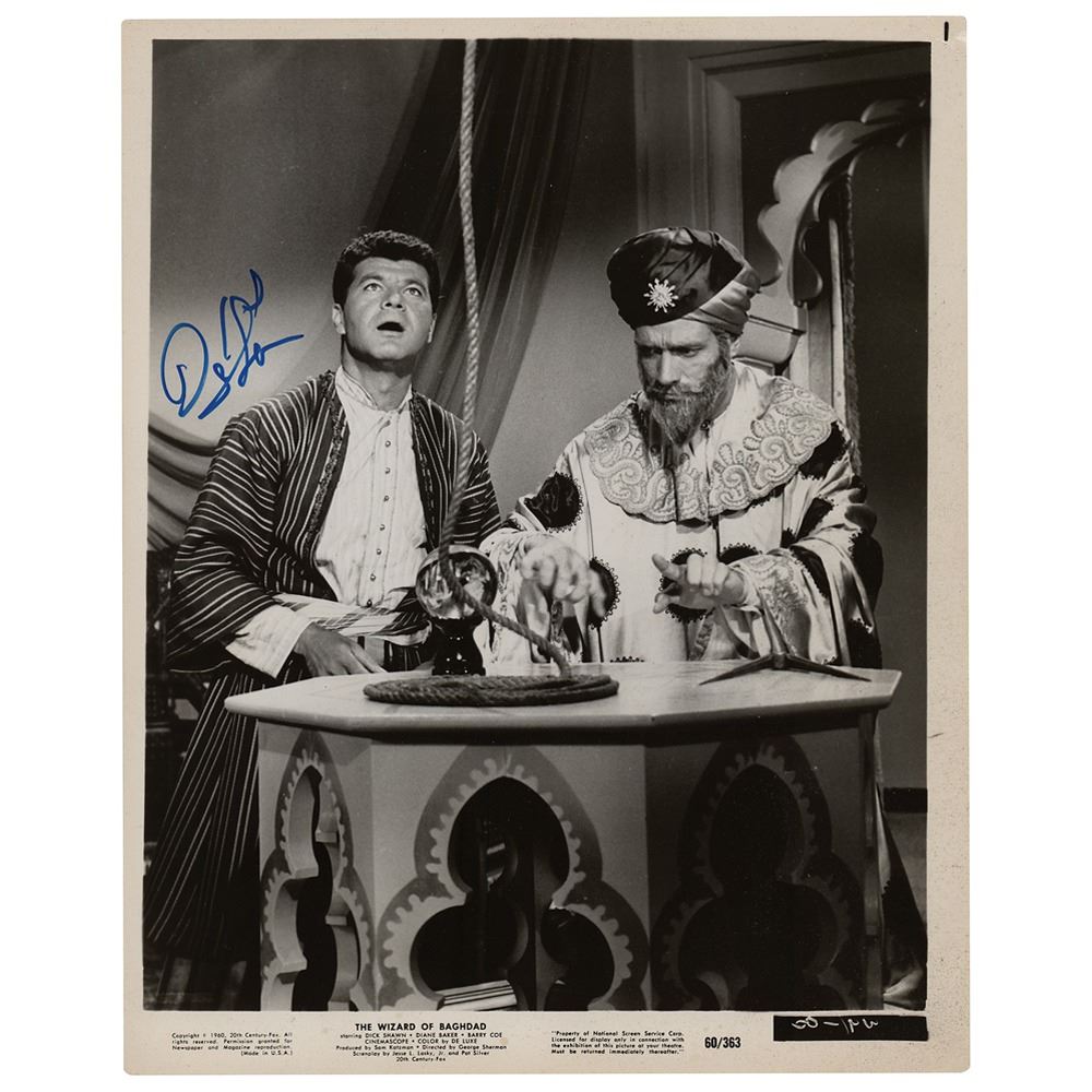 Glossy 8 x 10 publicity photo of Dick Shawn as Genii-Ali Mahmud in the 1960 film The Wizard of Baghdad photo, signed in blue felt tip. In fine condition.