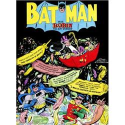 Dick Sprang - Original Art Splash Page Re-creation (1998). Dick Sprang has re-created an incredible image of the Penguin burying Batman and Robin under a landfall of feathers. We don't know exactly which issue this re-creation is from, but the image is so strong, who even cares? This picture will brighten up any room. Dick Sprang is one of the most masterful craftsmen to ever work on Batman, and all of his talent shows through with this incredible piece of art; it is extremely well done, and fully colored. It measures a giant 13" x 18" and is in perfect condition. Important notice: We expect to be auctioning lots at the rate of 200-250 per hour. Sometimes eBay Premier live bid software cannot keep up with that pace, so we strongly recommend that you place a realistic proxy bid now as insurance to avoid disappointment. Also please note that all Heritage/CAA lots purchased through eBay Premier carry a 20% Buyer's Premium.