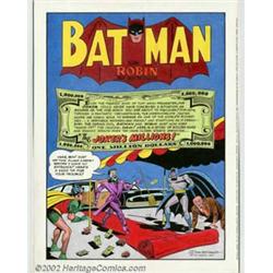 Dick Sprang - Recreation "The Joker's Millions" (undated). Dick Sprang began work on Batman during World War II. Consequently, a generation of readers and collectors think of Sprang as "the" Batman artist. Because vintage Sprang artwork exists in such small numbers, it is quite an occasion when a piece surfaces for sale. Panel pages come on the market infrequently, but the idea of owning a vintage cover or splash is a pipe dream. Luckily, Sprang did a series of recreations in the 1990s. Even more fortuitous for us, the old master never lost his touch. The work is executed to exacting standards, with amazing detail. This piece, rendered in mixed media on illustration board, is a genuinely finished painting, with vivid colors and a forceful presence. In superb condition, this piece measures approximately 20" X 15".  Important notice: We expect to be auctioning lots at the rate of 200-250 per hour. Sometimes eBay Premier live bid software cannot keep up with that pace, so we strongly recommend that you place a realistic proxy bid now as insurance to avoid disappointment. Also please note that all Heritage/CAA lots purchased through eBay Premier carry a 20% Buyer's Premium.