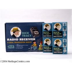 <B>Dick Tracy 2 Transistor Radio Receiver Store Display and 4 MIB Radios (American Doll and Toy Corp., 1961).</B></I> Offered here is an ultra-rare store display box with a stand-up display lid, for American Doll and Toy's <B>Dick Tracy 2 Transistor Radio Receiver</B></I>. The advertising tastes of the early 1960s are clearly represented with its graphics and colors, with pastels juxtaposed against a deep aqua background. The display box measures 14 1/2" x 11" x 1 3/4" and is in Excellent condition with very minimal corner wear. More treasures await inside: four MIB radios, each in 4 3/4" x 5 1/4" x 1 3/4" box showing Dick Tracy in profile. The radios are plastic with white backs and black tops showing Tracy profiles; each includes a black plastic case, shoulder strap, ear plug with wire, and a 9V battery. This wondrously attractive item will appeal to just about any baby boomer. <BR><BR><B>Important notice:</B> Heritage usually auctions material at the rate of 200-250 lots per hour. On some occasions eBay Live bid software or the Internet may not be able to keep up with the pace of the auction. We recommend placing a realistic absentee bid now as insurance to avoid disappointment. Occasionally the auctioneer may eliminate or reject an eBay Live bid, and the auctioneer may also reopen a lot after the close of the eBay live bidding (usually because we missed an audience bid), and may reject your bid even if it shows you as the winning bidder. By bidding via eBay Live, you agree that Heritage may award the lot to another bidder at its sole discretion under the circumstances described above or any other reasonable circumstances. Since eBay bids are not shown to us until we open the lot on the floor, we treat those bids just like floor bids. In most cases the floor responds before the eBay bid is presented to us, due to Internet lag time, so for consistency we have made it a policy that floor bids are always considered first over tie eBay live bids. Also please note that all Heritage lots purchased through eBay Live carry a 20% Buyer's Premium. Please make sure you read the Terms and Conditions before you bid.
