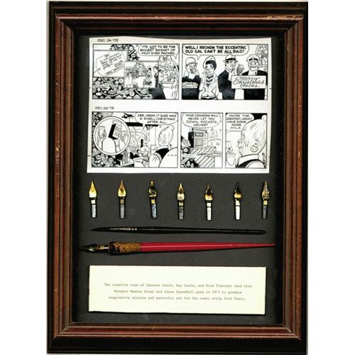 <B>Dick Tracy - Chester Gould and Rick Fletcher Framed Set of Pens and Brush (1973).</B></I> Offered here in a 11" x 14" box frame is a set of 8 Speedball pen tips with a wooden holder and a brush all used in 1973 by <B>Dick Tracy</B></I> cartoonists Chester Gould, Ray Gould, and Rick Fletcher. Also mounted in the window-box frame are an identifying placard and photostats of <B>Tracy</B></I> strips from 12-24-73 and 12-25-73. This unique collectible will be the envy of every Tracy collector and cartoonist. <BR><BR><B>Important notice:</B> Heritage usually auctions material at the rate of 200-250 lots per hour. On some occasions eBay Live bid software or the Internet may not be able to keep up with the pace of the auction. We recommend placing a realistic absentee bid now as insurance to avoid disappointment. Occasionally the auctioneer may eliminate or reject an eBay Live bid, and the auctioneer may also reopen a lot after the close of the eBay live bidding (usually because we missed an audience bid), and may reject your bid even if it shows you as the winning bidder. By bidding via eBay Live, you agree that Heritage may award the lot to another bidder at its sole discretion under the circumstances described above or any other reasonable circumstances. Since eBay bids are not shown to us until we open the lot on the floor, we treat those bids just like floor bids. In most cases the floor responds before the eBay bid is presented to us, due to Internet lag time, so for consistency we have made it a policy that floor bids are always considered first over tie eBay live bids. Also please note that all Heritage lots purchased through eBay Live carry a 22.5% Buyer's Premium. Please make sure you read the Terms and Conditions before you bid. This lot is being auctioned in conjunction with a live floor auction by Heritage Auction Galleries. All final auction and invoice information will be supplied by Heritage Auction Galleries, and all other information should be considered preliminary. Lot:41001 <BR><BR><B>Winning Notification and Billing:</B> After the FINAL session in this auction is complete, Heritage will send e-mail and snail mail invoices. This process normally takes several days. All final auction and invoice information will be supplied by Heritage Auction Galleries, and all other information should be considered preliminary. <BR><BR>This auction will be conducted on a live auction floor and over the Internet through eBay Live. If you choose to place an absentee bid, please take a moment to <font color='#0000ff'><u><a href='http://pages.ebay.com/liveauctions/help/before/laabsentee.html'>learn how eBay Live absentee bidding works</a></u></font><font color='#000000'>