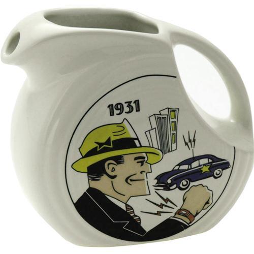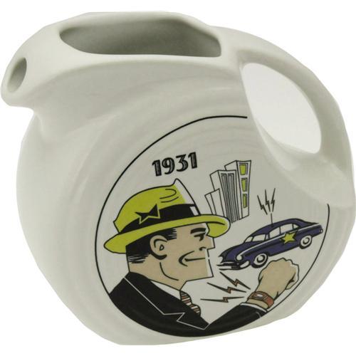 <B>Dick Tracy Limited Edition Ceramic Pitcher (Homer Laughlin, 1999).</B></I> Only subscribers to the Homer Laughlin Collectors Club of America were able to obtain this limited-edition Dick Tracy water pitcher in 1999 - until now. This white glazed ceramic dishware item features a retro image (in color) of Tracy on his 2-way wrist radio, communicating with a police car (a cityscape is the background scene). The year "1931," the initial year of the <B>Dick Tracy</B></I> comic strip, appears above the graphic. Measuring 6" high, this pitcher is in Mint condition and will appeal to the Tracy, cartoon, and glassware collector. <BR><BR><B>Important notice:</B> Heritage usually auctions material at the rate of 200-250 lots per hour. On some occasions eBay Live bid software or the Internet may not be able to keep up with the pace of the auction. We recommend placing a realistic absentee bid now as insurance to avoid disappointment. Occasionally the auctioneer may eliminate or reject an eBay Live bid, and the auctioneer may also reopen a lot after the close of the eBay live bidding (usually because we missed an audience bid), and may reject your bid even if it shows you as the winning bidder. By bidding via eBay Live, you agree that Heritage may award the lot to another bidder at its sole discretion under the circumstances described above or any other reasonable circumstances. Since eBay bids are not shown to us until we open the lot on the floor, we treat those bids just like floor bids. In most cases the floor responds before the eBay bid is presented to us, due to Internet lag time, so for consistency we have made it a policy that floor bids are always considered first over tie eBay live bids. Also please note that all Heritage lots purchased through eBay Live carry a 22.5% Buyer's Premium. Please make sure you read the Terms and Conditions before you bid. This lot is being auctioned in conjunction with a live floor auction by Heritage Auction Galleries. All final auction and invoice information will be supplied by Heritage Auction Galleries, and all other information should be considered preliminary. Lot:41001 <BR><BR><B>Winning Notification and Billing:</B> After the FINAL session in this auction is complete, Heritage will send e-mail and snail mail invoices. This process normally takes several days. All final auction and invoice information will be supplied by Heritage Auction Galleries, and all other information should be considered preliminary. <BR><BR>This auction will be conducted on a live auction floor and over the Internet through eBay Live. If you choose to place an absentee bid, please take a moment to <font color='#0000ff'><u><a href='http://pages.ebay.com/liveauctions/help/before/laabsentee.html'>learn how eBay Live absentee bidding works</a></u></font><font color='#000000'>
