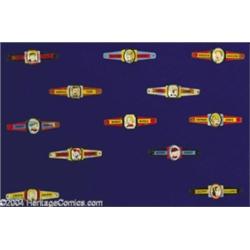 <B>Dick Tracy, Little Orphan Annie, and Others Post's Raisin Bran Comic Rings Complete Set of 12 (Post's, 1948-49) Condition: Average VF/NM.</B></I> You don't have to "collect 'em all" -- we've done it for you! Offered here is a complete set of the comic-strip-inspired "Comic Rings," 2 1/2" wide x 3/4" tall, full-color tin-litho rings bearing the images and names of a dozen popular characters from the funnies. The set features Dick Tracy, Little Orphan Annie, Smilin' Jack, Andy Gump, Harold Teen, Smokey Stover, Skeezix, Winnie Winkle, Perry Winkle, Herby, Smitty, and Lillums; most are NM, but a hint of rust on a few makes their average condition VF/NM. The set is mounted on a midnight-blue display and framed at a size of 17 1/4" x 13 1/2". <BR><BR><B>Important notice:</B> Heritage usually auctions material at the rate of 200-250 lots per hour. On some occasions eBay Live bid software or the Internet may not be able to keep up with the pace of the auction. We recommend placing a realistic absentee bid now as insurance to avoid disappointment. Occasionally the auctioneer may eliminate or reject an eBay Live bid, and the auctioneer may also reopen a lot after the close of the eBay live bidding (usually because we missed an audience bid), and may reject your bid even if it shows you as the winning bidder. By bidding via eBay Live, you agree that Heritage may award the lot to another bidder at its sole discretion under the circumstances described above or any other reasonable circumstances. Since eBay bids are not shown to us until we open the lot on the floor, we treat those bids just like floor bids. In most cases the floor responds before the eBay bid is presented to us, due to Internet lag time, so for consistency we have made it a policy that floor bids are always considered first over tie eBay live bids. Also please note that all Heritage lots purchased through eBay Live carry a 20% Buyer's Premium. Please make sure you read the Terms and Conditions before you bid.
