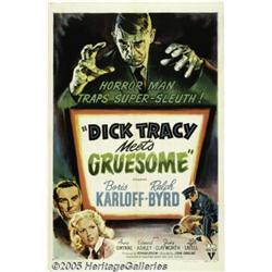 <B>Dick Tracy Meets Gruesome (RKO, 1947)</B></I> One Sheet (27" X 41"). This was RKO's final film, and most certainly the best, in the studio's 1940s series that featured Chester Gould's immortal comic-strip crime fighter, Dick Tracy. Ralph Byrd who began as the first screen Tracy in the 1937 Republic serial and continued in three more serials, made his final appearance as Tracy in this film. The film also featured famous screen master-of-horror, Boris Karloff as the sinister Gruesome. This poster has staple holes across the top of the upper border and a small chip out of the top border. It has one pinhole in the two lower corners and a small chip out of the lower left corner. This sheet is in exceptionally clean condition and unbacked. Very Fine-.