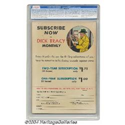 <B>Dick Tracy Monthly #10 File Copy (Dell, 1948) CGC NM- 9.2 Off-white pages.</B></I> Gorgeous copy is the only one CGC has certified to date for issue #10. Overstreet 2004 NM- 9.2 value = $300. <I>From the collection of Larry Doucet.</B></I> <BR><BR><B>Important notice:</B> Heritage usually auctions material at the rate of 200-250 lots per hour. On some occasions eBay Live bid software or the Internet may not be able to keep up with the pace of the auction. We recommend placing a realistic absentee bid now as insurance to avoid disappointment. Occasionally the auctioneer may eliminate or reject an eBay Live bid, and the auctioneer may also reopen a lot after the close of the eBay live bidding (usually because we missed an audience bid), and may reject your bid even if it shows you as the winning bidder. By bidding via eBay Live, you agree that Heritage may award the lot to another bidder at its sole discretion under the circumstances described above or any other reasonable circumstances. Since eBay bids are not shown to us until we open the lot on the floor, we treat those bids just like floor bids. In most cases the floor responds before the eBay bid is presented to us, due to Internet lag time, so for consistency we have made it a policy that floor bids are always considered first over tie eBay live bids. Also please note that all Heritage lots purchased through eBay Live carry a 20% Buyer's Premium. Please make sure you read the Terms and Conditions before you bid.