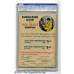 <B>Dick Tracy Monthly #2 File Copy (Dell, 1948) CGC VF/NM 9.0 Off-white pages.</B></I> This is the highest-graded copy of the issue (and the only one graded above 9.0) that CGC has certified to date. Overstreet 2004 VF/NM 9.0 value = $255; NM- 9.2 value = $335.<I>From the collection of Larry Doucet.</B></I> <BR><BR><B>Important notice:</B> Heritage usually auctions material at the rate of 200-250 lots per hour. On some occasions eBay Live bid software or the Internet may not be able to keep up with the pace of the auction. We recommend placing a realistic absentee bid now as insurance to avoid disappointment. Occasionally the auctioneer may eliminate or reject an eBay Live bid, and the auctioneer may also reopen a lot after the close of the eBay live bidding (usually because we missed an audience bid), and may reject your bid even if it shows you as the winning bidder. By bidding via eBay Live, you agree that Heritage may award the lot to another bidder at its sole discretion under the circumstances described above or any other reasonable circumstances. Since eBay bids are not shown to us until we open the lot on the floor, we treat those bids just like floor bids. In most cases the floor responds before the eBay bid is presented to us, due to Internet lag time, so for consistency we have made it a policy that floor bids are always considered first over tie eBay live bids. Also please note that all Heritage lots purchased through eBay Live carry a 20% Buyer's Premium. Please make sure you read the Terms and Conditions before you bid.