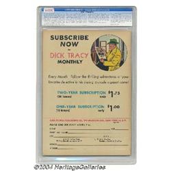 <B>Dick Tracy Monthly #4 File Copy (Dell, 1948) CGC VF/NM 9.0 Cream to off-white pages.</B></I> Super-sharp copy just happens to be the highest-graded from CGC to date of this early issue. Overstreet 2004 VF/NM 9.0 value = $228; NM- 9.2 value = $300. <I>From the collection of Larry Doucet.</B></I> <BR><BR><B>Important notice:</B> Heritage usually auctions material at the rate of 200-250 lots per hour. On some occasions eBay Live bid software or the Internet may not be able to keep up with the pace of the auction. We recommend placing a realistic absentee bid now as insurance to avoid disappointment. Occasionally the auctioneer may eliminate or reject an eBay Live bid, and the auctioneer may also reopen a lot after the close of the eBay live bidding (usually because we missed an audience bid), and may reject your bid even if it shows you as the winning bidder. By bidding via eBay Live, you agree that Heritage may award the lot to another bidder at its sole discretion under the circumstances described above or any other reasonable circumstances. Since eBay bids are not shown to us until we open the lot on the floor, we treat those bids just like floor bids. In most cases the floor responds before the eBay bid is presented to us, due to Internet lag time, so for consistency we have made it a policy that floor bids are always considered first over tie eBay live bids. Also please note that all Heritage lots purchased through eBay Live carry a 20% Buyer's Premium. Please make sure you read the Terms and Conditions before you bid.