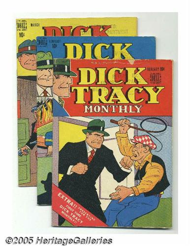 <B>Dick Tracy Monthly File Copies Group (Dell, 1948-49) Condition: Average VF-.</B></I> This group of file copies includes #1-18 and #21. Issue #1 is VG-; the others average VF-, with grades ranging from FN- to VF/NM. All copies have a stamp on the cover reading "Return to: Editorial Department, Western Printing and Litho Co. Racine, Wisconsin." Most have the words "File Copy" handwritten in pen at the top of the cover; some have the notation "Read 12-2-49" (or the respective date) handwritten in pen at the top of the cover. Approximate Overstreet value for group = $2,200. <I>From the Random House Archives.</B></I>