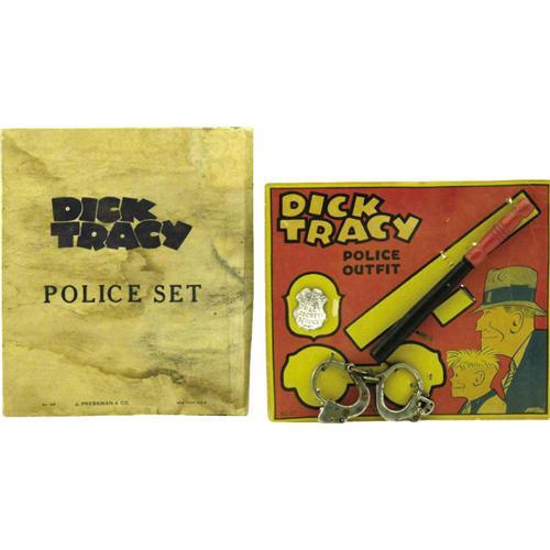 <B>Dick Tracy Police Outfit on Card (J. Pressman Co., mid-1930s).</B></I> Hearkening back to the days when a father could buy his son a working pair of cuffs and a wooden stick comes the <B>Dick Tracy Police Outfit</B></I>. A color display card measuring 11" x 13" reveals the profiles of Dick Tracy and Junior, and Tracy's logo, endorsing the accessories attached: a silvered "Dick Tracy Secret Service" badge; a 10-inch-long wooden billy club, black with a red handle; and a pair of silver, kid-sized handcuffs. An empty area on the card suggests there was a fourth item, perhaps a whistle, judging from its size. The billy club and card are in superb shape. The badge and cuffs show some rust - but given their age, that's to be expected. Also included is the original cardboard box for this item. <BR><BR><B>Important notice:</B> Heritage usually auctions material at the rate of 200-250 lots per hour. On some occasions eBay Live bid software or the Internet may not be able to keep up with the pace of the auction. We recommend placing a realistic absentee bid now as insurance to avoid disappointment. Occasionally the auctioneer may eliminate or reject an eBay Live bid, and the auctioneer may also reopen a lot after the close of the eBay live bidding (usually because we missed an audience bid), and may reject your bid even if it shows you as the winning bidder. By bidding via eBay Live, you agree that Heritage may award the lot to another bidder at its sole discretion under the circumstances described above or any other reasonable circumstances. Since eBay bids are not shown to us until we open the lot on the floor, we treat those bids just like floor bids. In most cases the floor responds before the eBay bid is presented to us, due to Internet lag time, so for consistency we have made it a policy that floor bids are always considered first over tie eBay live bids. Also please note that all Heritage lots purchased through eBay Live carry a 22.5% Buyer's Premium. Please make sure you read the Terms and Conditions before you bid. This lot is being auctioned in conjunction with a live floor auction by Heritage Auction Galleries. All final auction and invoice information will be supplied by Heritage Auction Galleries, and all other information should be considered preliminary. Lot:41001 <BR><BR><B>Winning Notification and Billing:</B> After the FINAL session in this auction is complete, Heritage will send e-mail and snail mail invoices. This process normally takes several days. All final auction and invoice information will be supplied by Heritage Auction Galleries, and all other information should be considered preliminary. <BR><BR>This auction will be conducted on a live auction floor and over the Internet through eBay Live. If you choose to place an absentee bid, please take a moment to <font color='#0000ff'><u><a href='http://pages.ebay.com/liveauctions/help/before/laabsentee.html'>learn how eBay Live absentee bidding works</a></u></font><font color='#000000'>