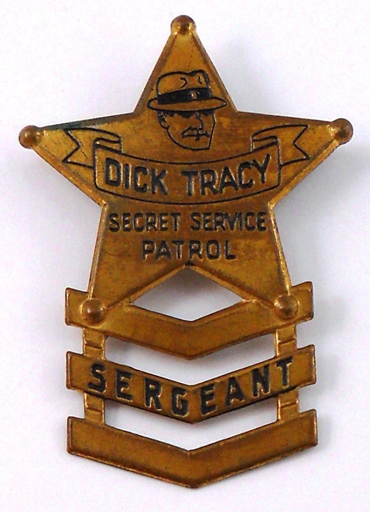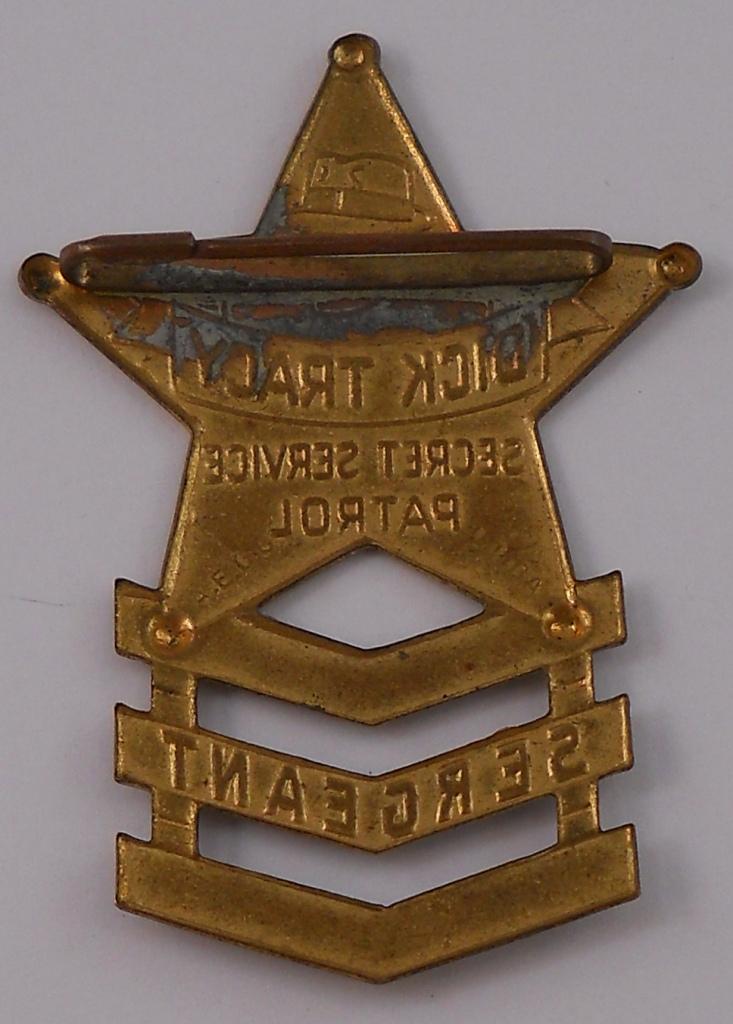 Here is a Dick Tracy Secret Service Patrol Sergeant Brass Badge. These were premiums given away in 1938. The approximate size is 1-7/8 inches wide x 2-3/4 inches tall. It is in excellent condition and has all of the black lettering present.