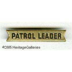 <B>Dick Tracy Secret Service Patrol - Patrol Leader Brass Bar (Quaker, 1938) Condition: VF.</B></I> Quaker Puffed Wheat and Quaker Puffed Rice offered a series of premiums with the "Dick Tracy Secret Service Patrol" theme. As children ate cereal and sent in proof-of-purchase, they would be promoted through the ranks and obtain increasingly important badges. Ranks progressed from Member, 2nd Year Member, Sergeant, Lieutenant, Captain, Inspector General, and finally the highest rank: the "Patrol Leader" brass bar. In fantastic condition, with only the slightest signs of age. <B>Hake's Price Guide to Character Toys</B></I> describes this item as "rare." As the promotion lasted only from 1938 to 1939 there probably weren't many kids who could eat enough cereal to qualify for the top ranks! <I>From the Collection of Larry Doucet</B></I>.