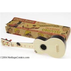 <B>Dick Tracy Sparkle Plenty Islander Ukette NMIB (Styron, 1950).</B></I> You can strum to your heart's content with this plastic, 15"-long ukulele, "an actual musical instrument, junior size!" The ukette's fret pictures Dick, Tracy, B. O. Plenty, Gravel Gertie, Junior, and Tess; the top of fret shows "Sparkle Plenty Islander Ukette" with an image of Sparkle. The toy is in NM condition with 4 strings, a felt pick, and an instruction booklet. The 15 1/2" x 5" x 2" four-color (red, yellow, black, and flesh tone) box depicts Sparkle, Tracy, and other cast members; the box is perfect for display, in VG condition with the left box flaps missing. <BR><BR><B>Important notice:</B> Heritage usually auctions material at the rate of 200-250 lots per hour. On some occasions eBay Live bid software or the Internet may not be able to keep up with the pace of the auction. We recommend placing a realistic absentee bid now as insurance to avoid disappointment. Occasionally the auctioneer may eliminate or reject an eBay Live bid, and the auctioneer may also reopen a lot after the close of the eBay live bidding (usually because we missed an audience bid), and may reject your bid even if it shows you as the winning bidder. By bidding via eBay Live, you agree that Heritage may award the lot to another bidder at its sole discretion under the circumstances described above or any other reasonable circumstances. Since eBay bids are not shown to us until we open the lot on the floor, we treat those bids just like floor bids. In most cases the floor responds before the eBay bid is presented to us, due to Internet lag time, so for consistency we have made it a policy that floor bids are always considered first over tie eBay live bids. Also please note that all Heritage lots purchased through eBay Live carry a 20% Buyer's Premium. Please make sure you read the Terms and Conditions before you bid.