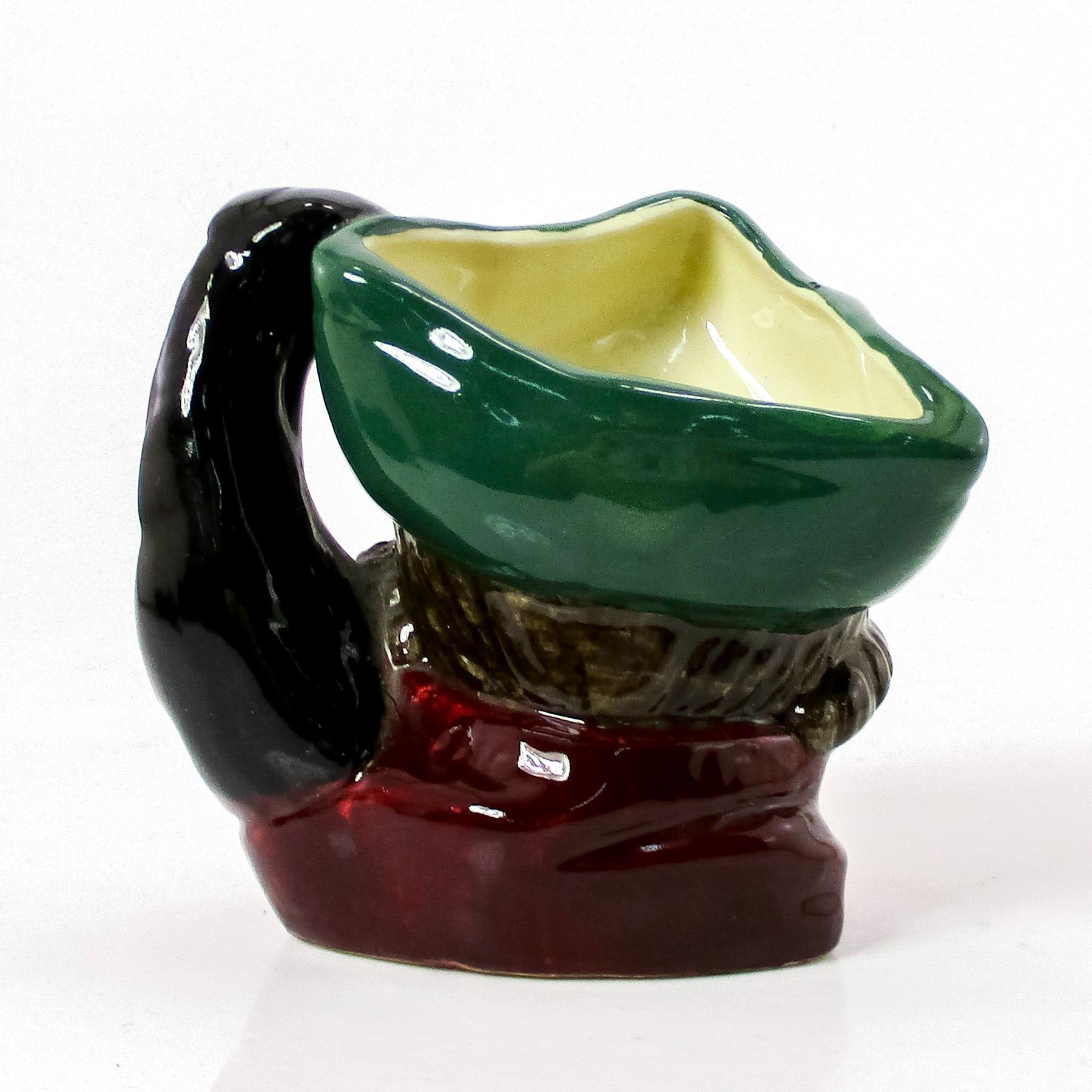 Style Two, neck and head of horse handle. Green tricorn; black mask over the eyes; red jacket. The first style of the Dick Turpin jug has the mask up on the brim of the tricorn, and a pistol forms the handle. All of the sizes should have "R.T." inscribed on the pistol grip, however, it may be more obvious on certain jugs due to the casting variations. This second style of Dick Turpin has the mask covering the eyes, and the handle depicts a horse's head and neck.