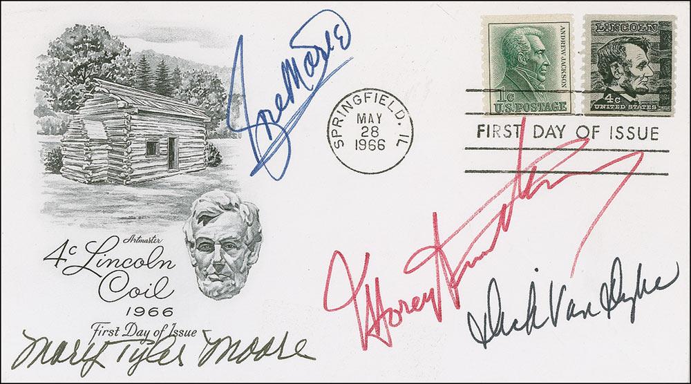 FDC with a cachet honoring Abraham Lincoln, postmarked Springfield Illinois, May 28, 1966, signed in various color felt tip by Dick Van Dyke, Mary Tyler Moore, Rose Marie, and Morey Amsterdam. In very fine condition.