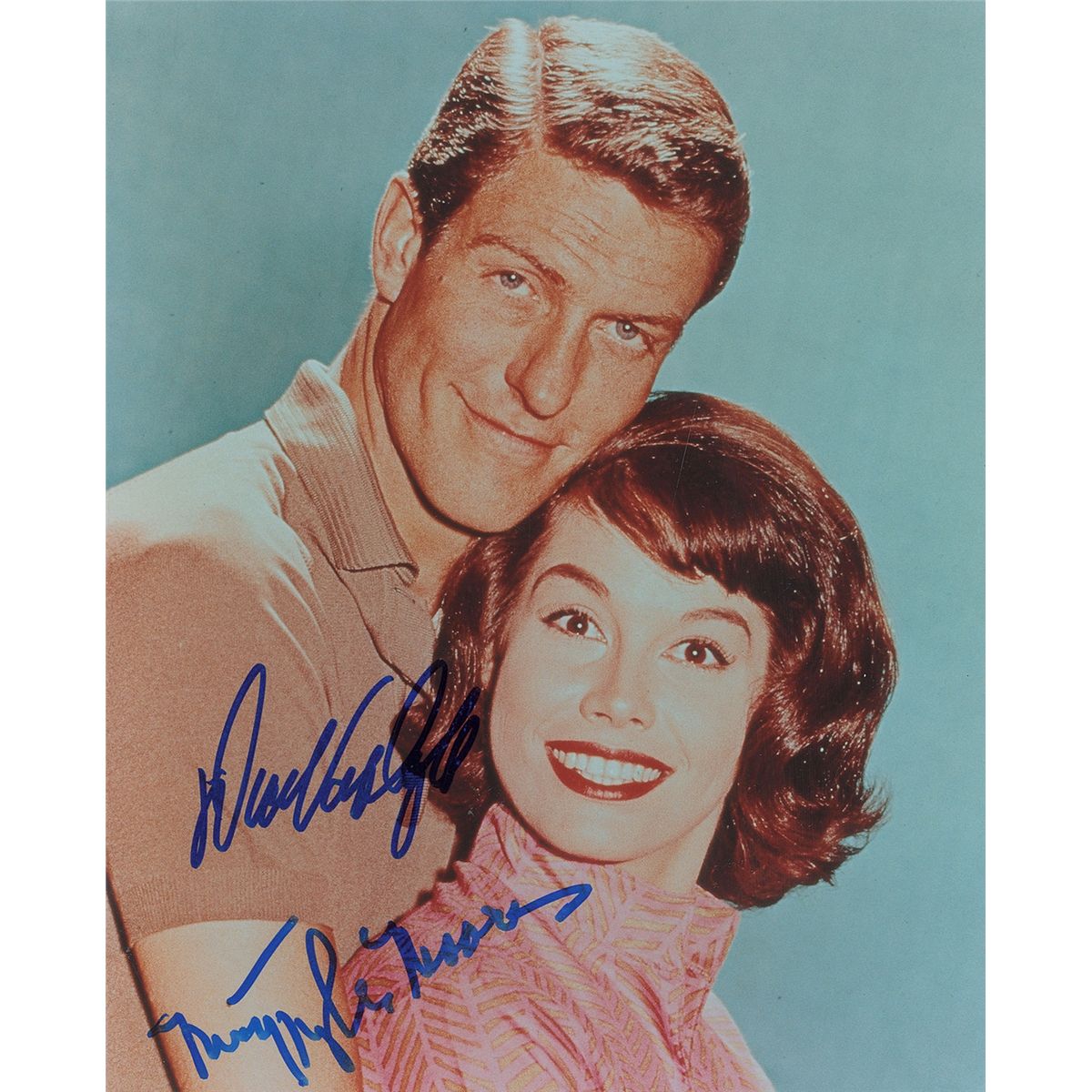 Color glossy 8 x 10 photo of the television couple, signed in blue felt tip by Dick Van Dyke and Mary Tyler Moore. In fine condition.
