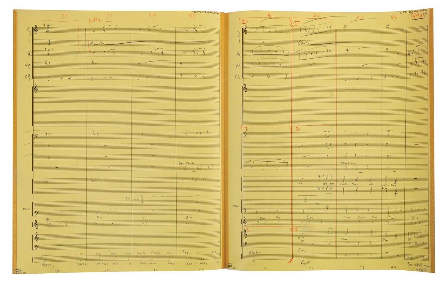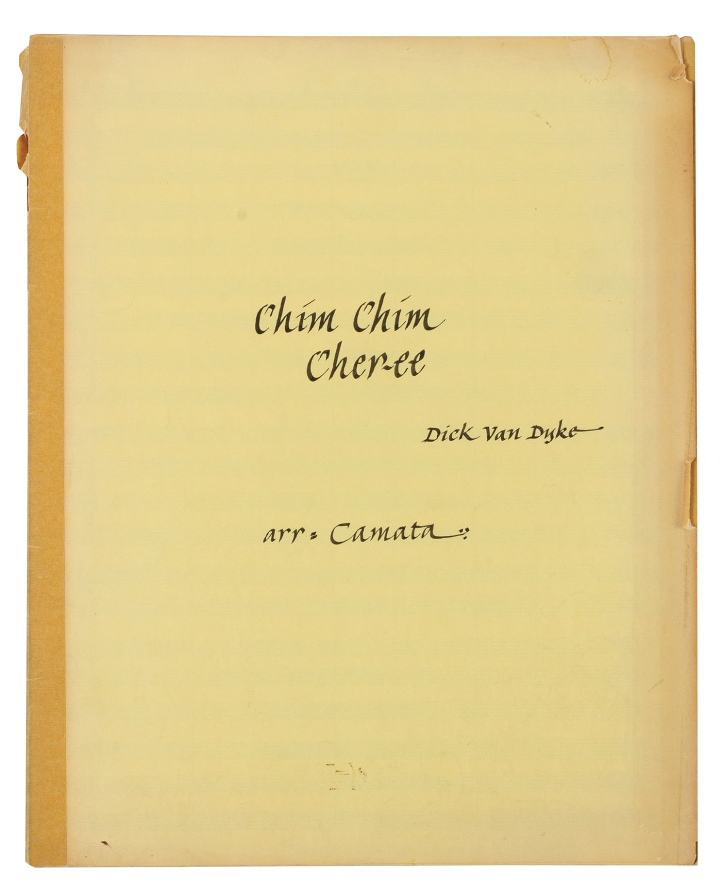 (Disney, c.1964) An original hand-written musical arrangement for Dick Van Dyke's performance of "Chim Chim Cher-ee." Composed by Salvador "Tutti" Camarata, this arrangement was likely created for Van Dyke to perform for the record "10 Songs from Mary Poppins," however singer Bill Lee ultimately provided the voice for the final recording. This musical arrangement is hand-written in pencil on (27) pre-lined music sheets and is labeled for Dick Van Dyke. Measuring 15.75"x12.5" within the hand-assembled cover, the arrangement is in very good condition with some wear around the edges and to the spine from use and age.