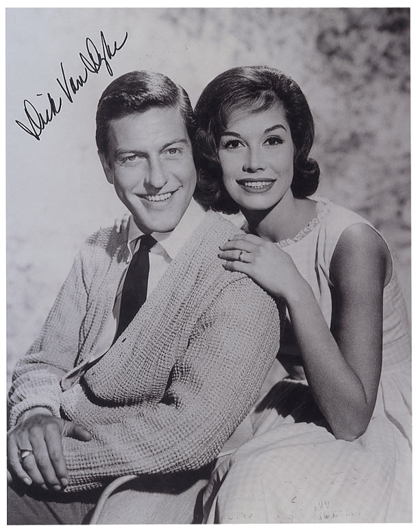 Glossy 11 x 14 photo of Dick Van Dyke and Mary Tyler Moore, signed in black felt tip by Van Dyke. In fine condition, with some light surface marks towards the lower right corner.
