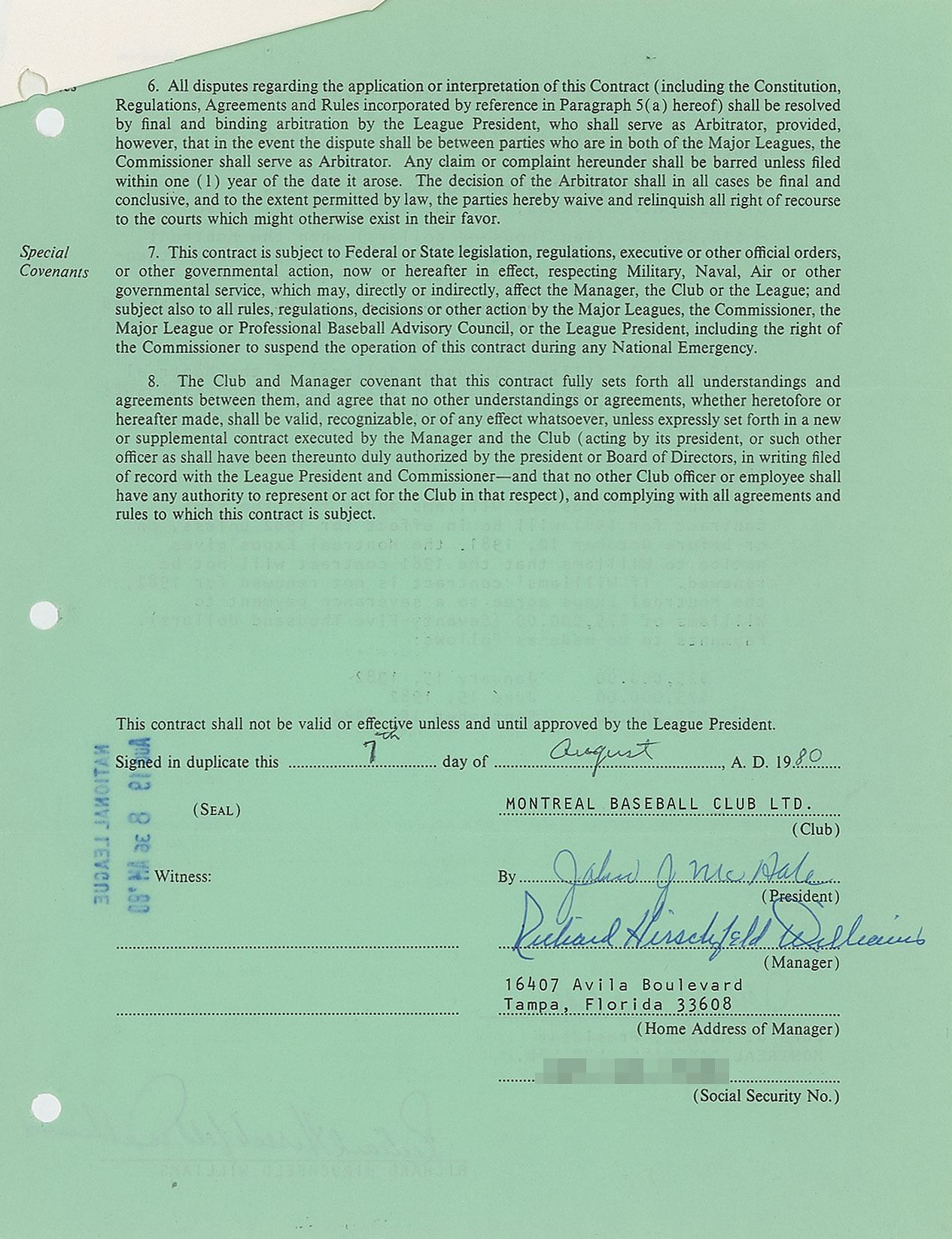 Contract, signed “Richard Hirschfeld Williams,” four pages on two adjoining sheets, 8.5 x 11, August 7, 1980. National League uniform manager’s contract in which Dick Williams agrees to render "skilled service as such in connection with all baseball activities of the Club during the years 1980, 1981” for the Montreal Expos, for an aggregate salary of $125,000. Signed at the conclusion in blue ballpoint by Williams and countersigned by Expos General Manager John McHale, with both men signing the reverse in regard to incentive bonuses. Stapled to the contract is a Montreal Expos ‘Acknowledgment of Loan’ sheet, signed and dated in black ballpoint by Williams, who agrees to pay a cash loan of $15,000 in 12 monthly payroll deductions. The front of the contract is signed by National League President Chub Feeney. In fine condition.
