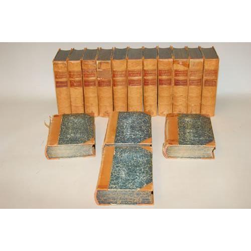 Dickens, Charles. Dickens' Complete Works - Illustrated - Complete in 15 Volumes. Boston: Aldine Book Publishing Co., 12mo - over 6¾" - 7¾" tall. Hard Cover. Fair to Good Condition. NOT EX-LIBRARY. Circa 1888. Bound in 3/4 leather & marbled paper, with leather spine labels, marbled page edges all around, marbled endpapers, bindings tight. Owners name on ffp's with date 1889, pages age darkened, occasional foxing on prelims, occasional backstrip wear/loss.