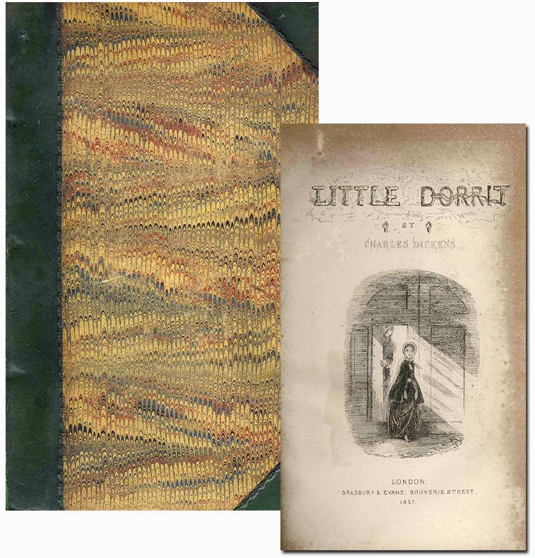 ''Little Dorrit'' by Charles Dickens. London: Bradbury & Evans: 1857. Hardcover with H. K. ''Phiz'' Browne illustrations. First edition, first printing rare book. Includes all first printing points: B2 instead of BB2 on p. 371, and ''Rigaud'' for ''Blandois'' on p. 469, 470, 472, and 473. Quarter-leather boards dating from the mid 19th century. Upper spine internally reinforced. Only a few small stains and minimal foxing. Very good condition.