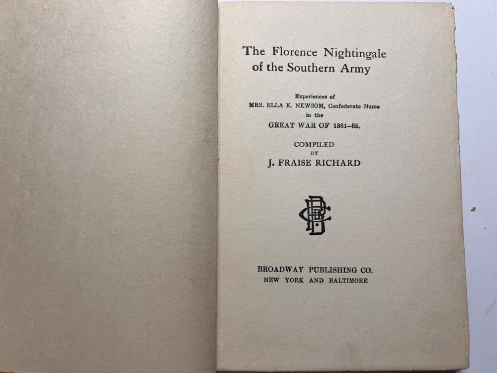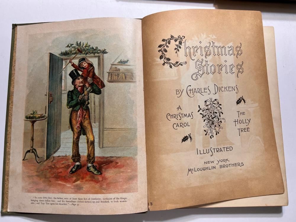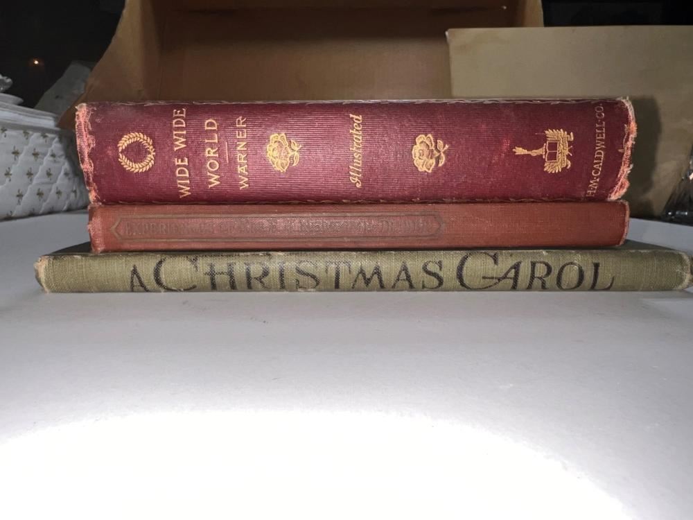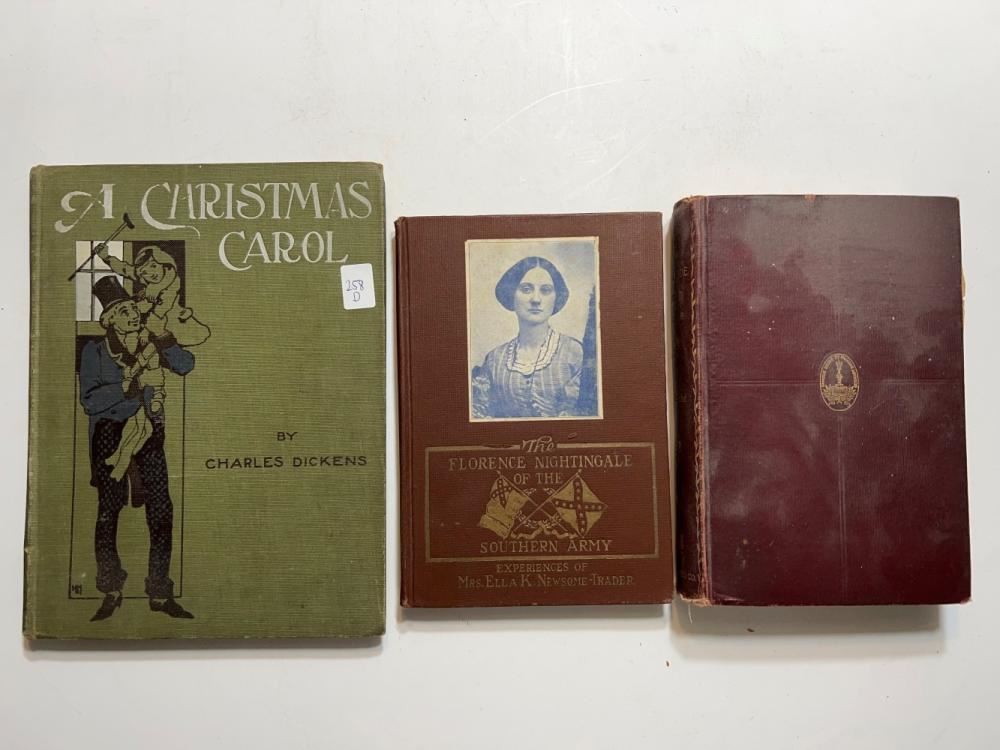 3 books including A Christmas Carol by Charles DIckens, The Florence Nightingale of the Southern Army by Mrs. Ella K. Newsome-Trader, and Wide Wide World by Susan Warner.