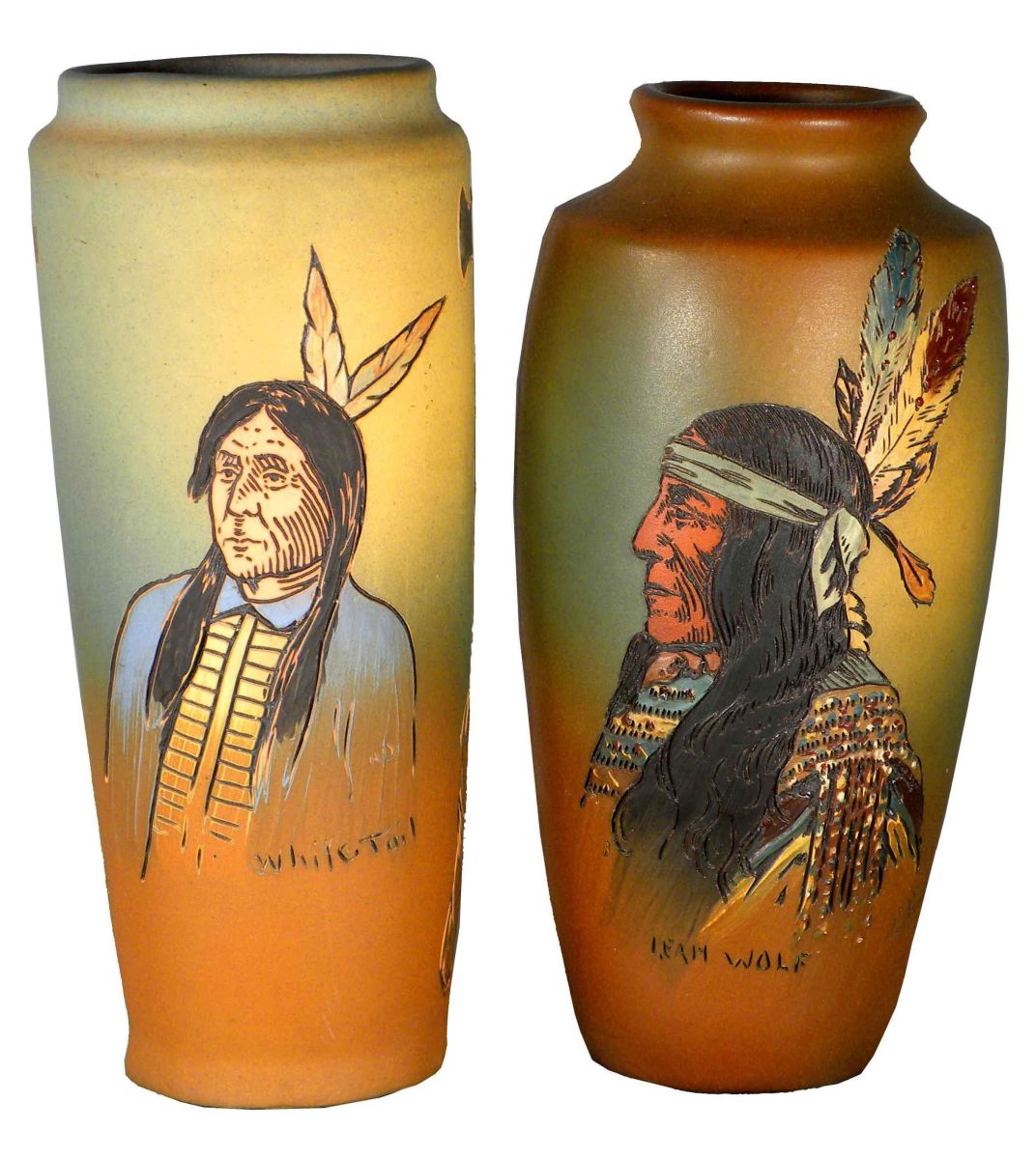 Lot of two Dickens's Ware Weller Art Pottery Vases. Depicting white tail and lean wolf. No chips or cracks, excellent condition. Aprox. 7 1/2 inches tall.