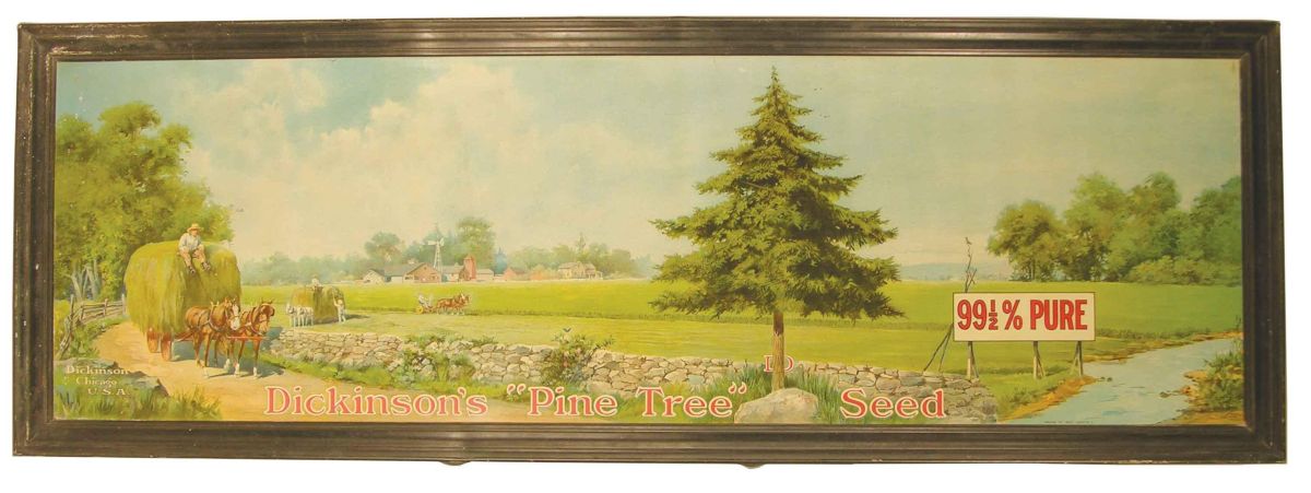 Dickinson's Pine Tree Seed, Self Framed Tin Sign. Chicago, USA. A few scuffs on outer frame otherwise very good condition. 37 1/2 X 13 inches.