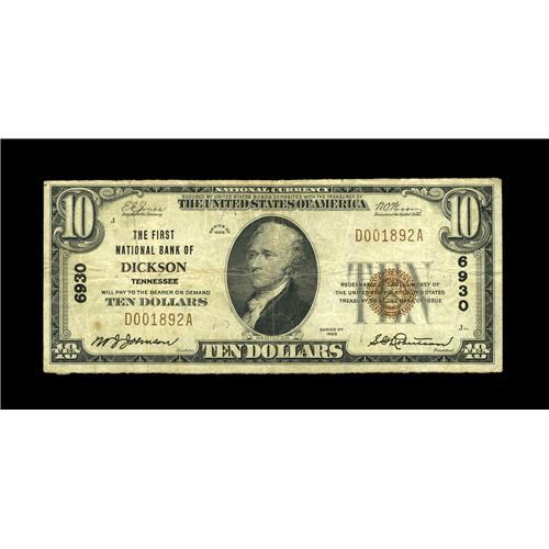 <B>Dickson, TN</B></I> - $10 1929 Ty. 1 <B>The First NB</B></I> Ch. # 6930<BR>A nice, evenly circulated example from this very scarce bank. Pleasing <B>Fine-Very Fine.</B></I>