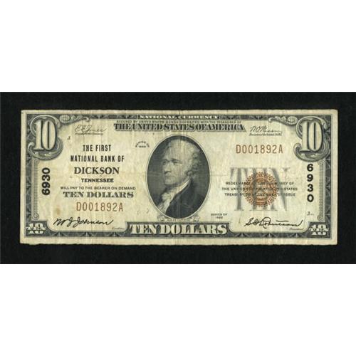 <B>Dickson, TN</B></I> - $10 1929 Ty. 1 <B>The First NB</B></I> Ch. # 6930<BR> From our FUN sale in January 2006, this note was described as a pleasing <B>Fine-Very Fine</B></I>. This is another opportunity to pick up a nice note on a scarce Tennessee bank.<BR><BR><b>Shipping:</b> Coins & Currency (<a target="_blank" href="http://www.heritageauctions.com/common/shipping.php">view shipping information</a>)