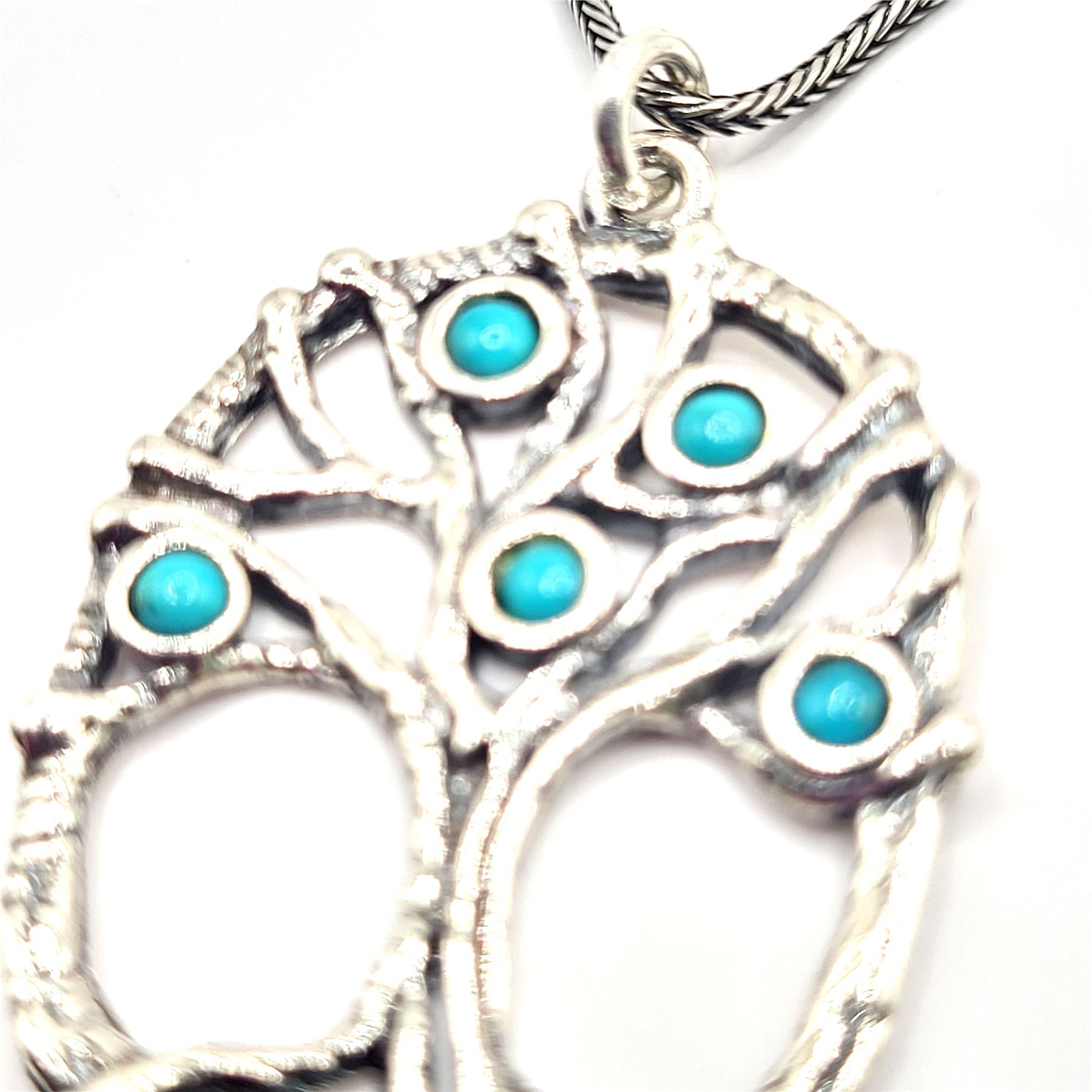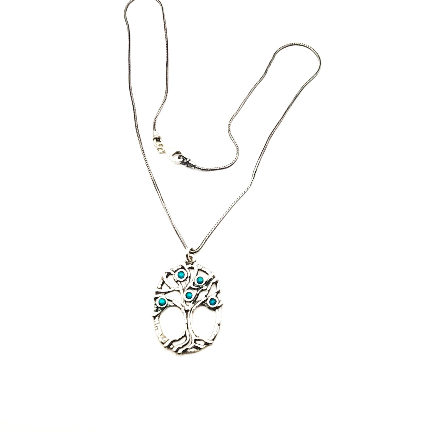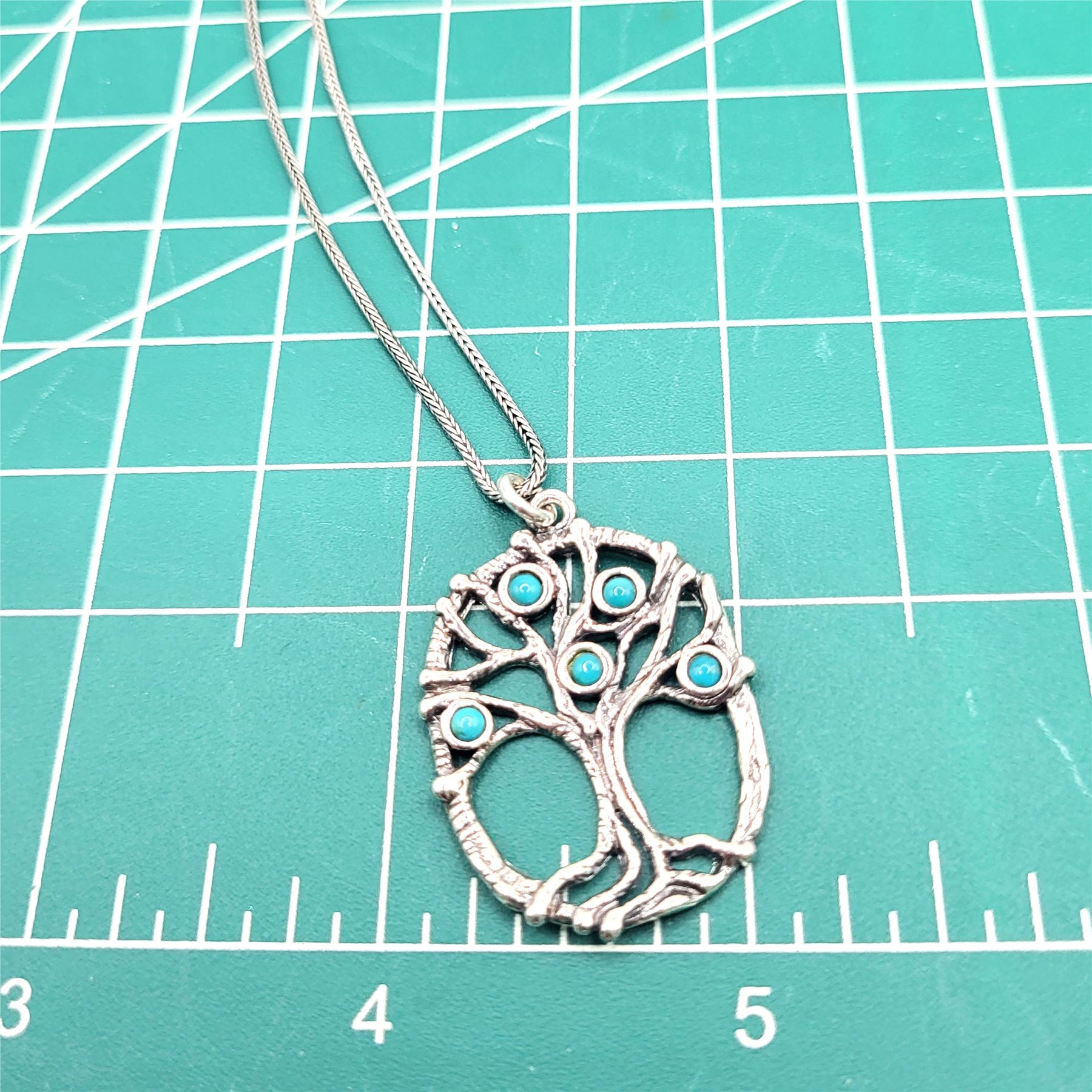 This sterling silver (.925) necklace, signed Didae, ISRAEL and .925 on back and features turquoise blue Murano glass beads in the Tree of Life.& nbsp; The tree is displayed inside an oval frame and hangs from an 18& quot; sterling silver wheat chain with a lobster clasp. The pendant is approximately 1 3/8& quot; x 1& quot;.& nbsp; Admin:& nbsp;