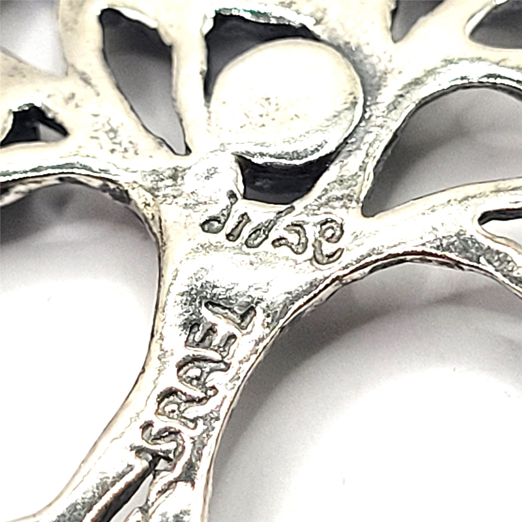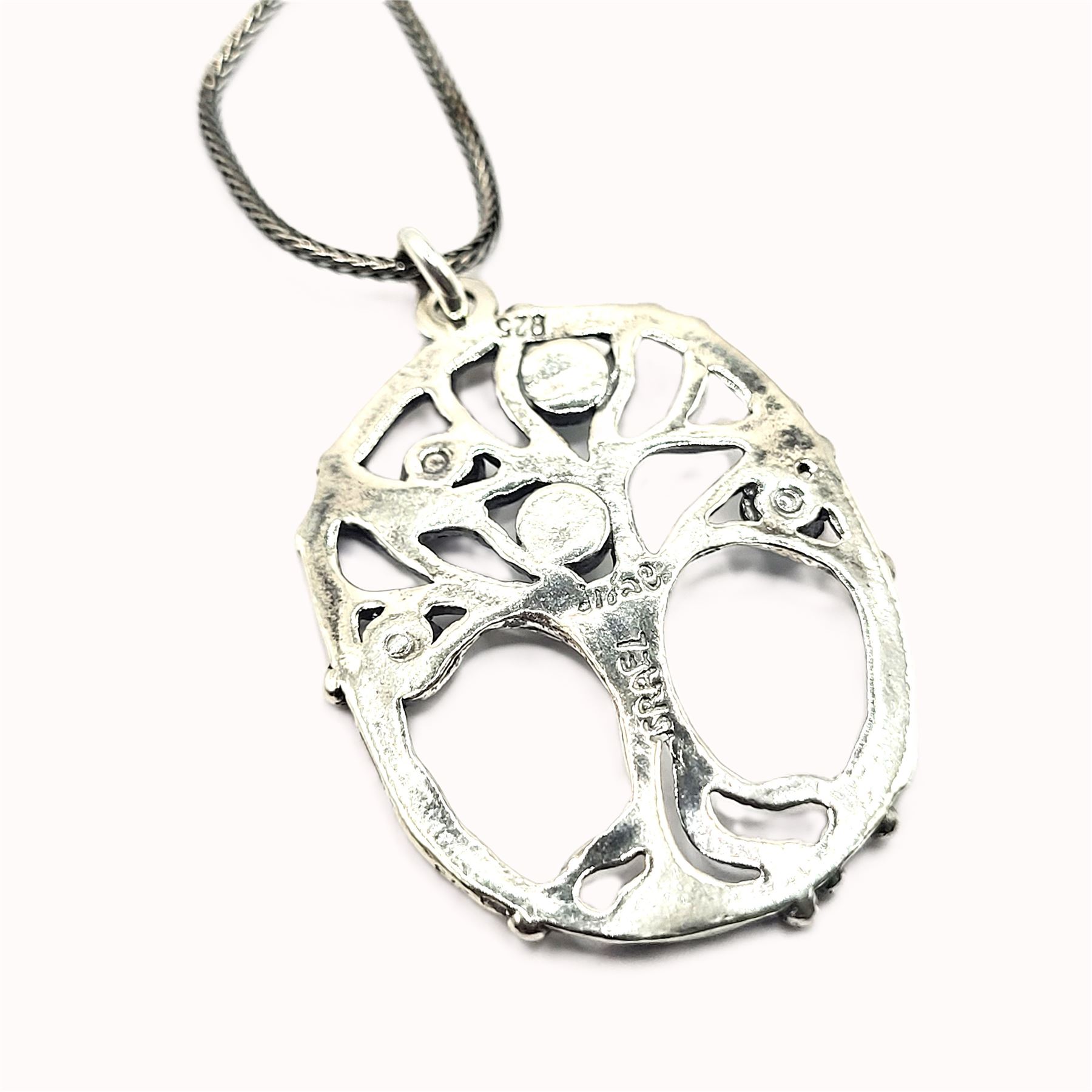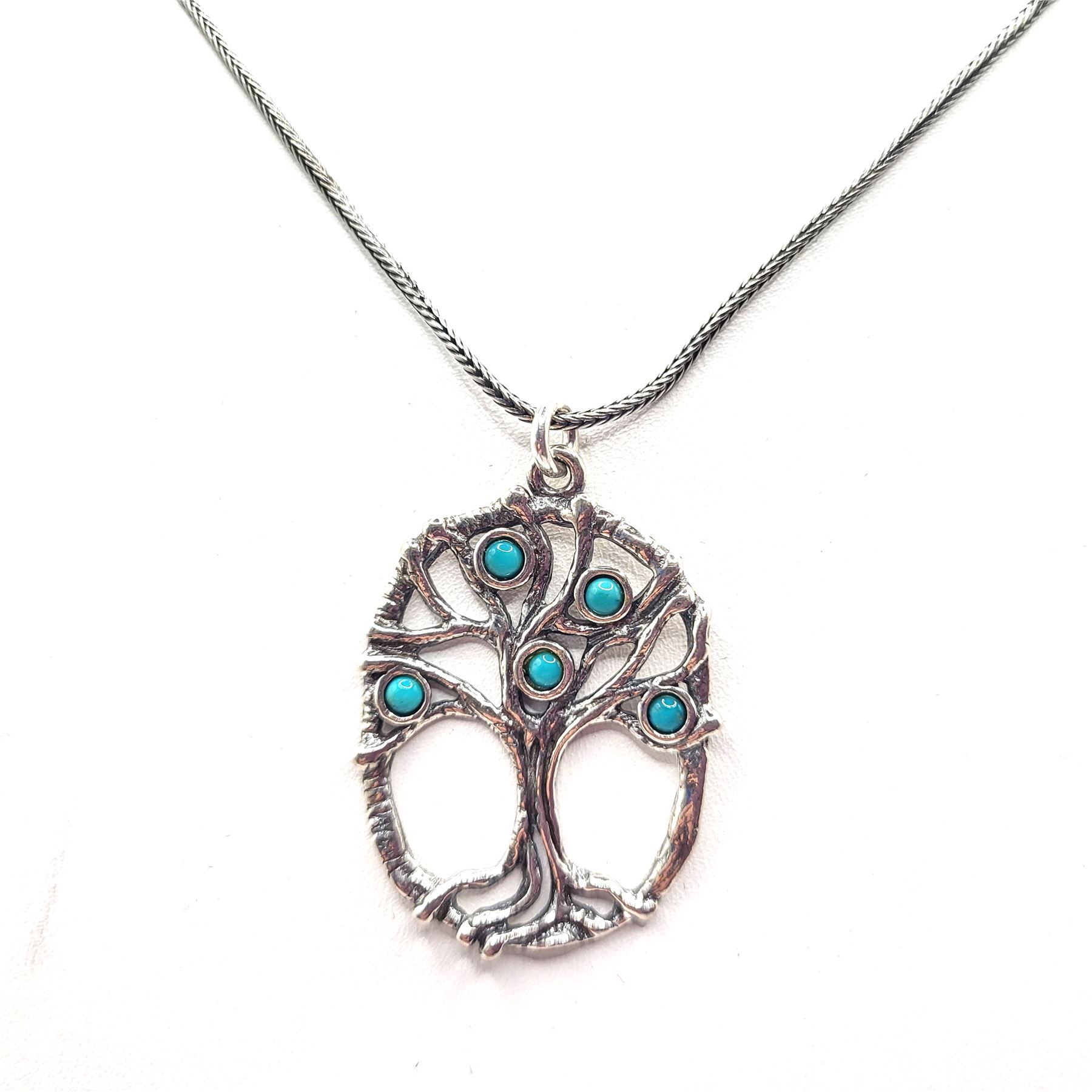 This sterling silver (.925) necklace, signed Didae, ISRAEL and .925 on back and features turquoise blue Murano glass beads in the Tree of Life.& nbsp; The tree is displayed inside an oval frame and hangs from an 18& quot; sterling silver wheat chain with a lobster clasp. The pendant is approximately 1 3/8& quot; x 1& quot;.& nbsp; Admin:& nbsp;