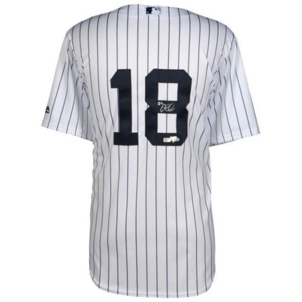 Majestic Cool Base on-field style jersey, everything is sewn on. The jersey has been hand-signed in silver paint pen by Didi Gregorius.