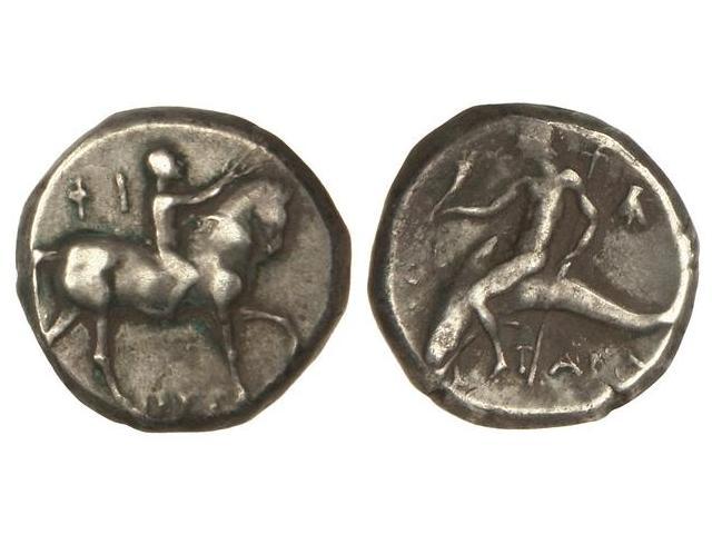 Didracma. 302-281 a.C. TARAS. CALABRIA. Anv.: Jinete a derecha. Rev.: Taras sentado a izquierda sobre delfín. AR. Se-363 sim. MBC-.