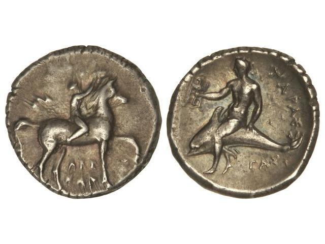 Didracma. - 360-300 a.C. - TARAS. TARENTO. - Anv.: Jinete a caballo a derecha, debajo leyenda. Rev.: Taras sentada sobre delfín a izquierda sosteniendo ¿trípode?, alrededor leyenda. 7,90 grs. AR. Pátina. Se-363 var. EBC-/EBC. - -