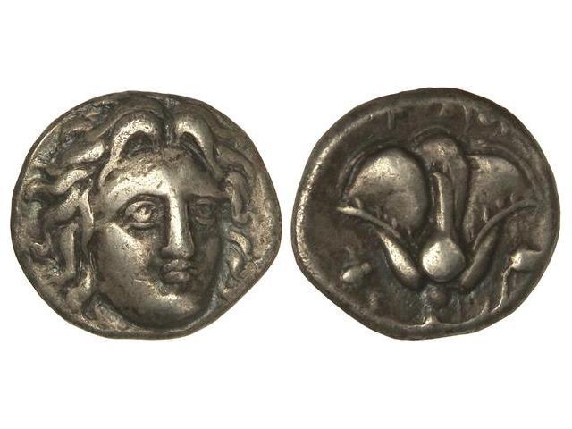 Didrama. - 387-304 a.C. - RODAS. - Anv.: Cabeza de Helios de frente mirando a derecha. Rev.: Rose, encima leyenda (poco visible). 6,70 grs. AR. Se-5037. MBC+. - -