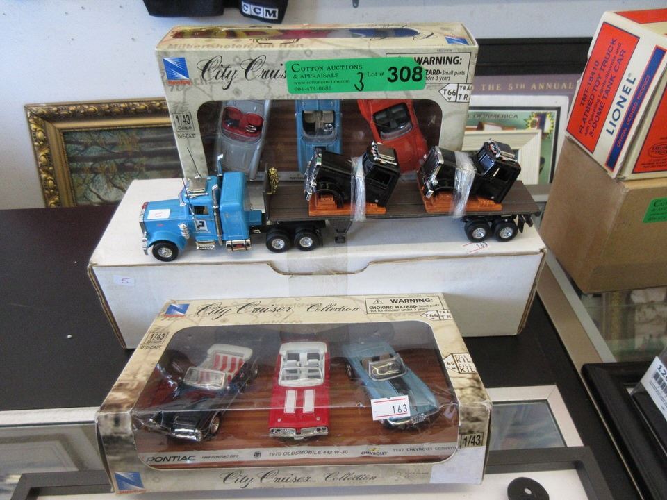 Matchbox Peterbilt tractor/trailer & 2 "New Ray" 1:43 scale 3 piece car sets.