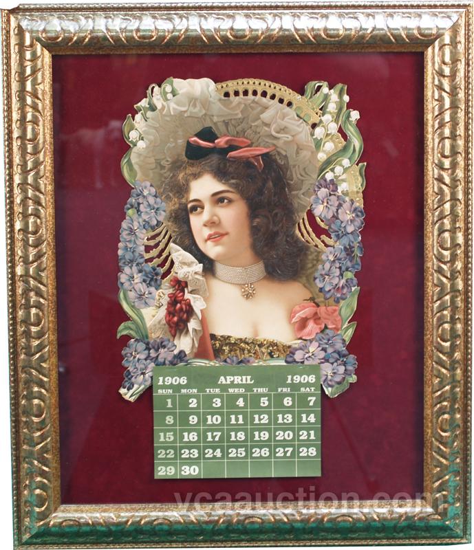 Die-Cut Embossed Cardboard Calendar Top w/ pretty lady & 1906 date pad, in frame - 22" x 26"